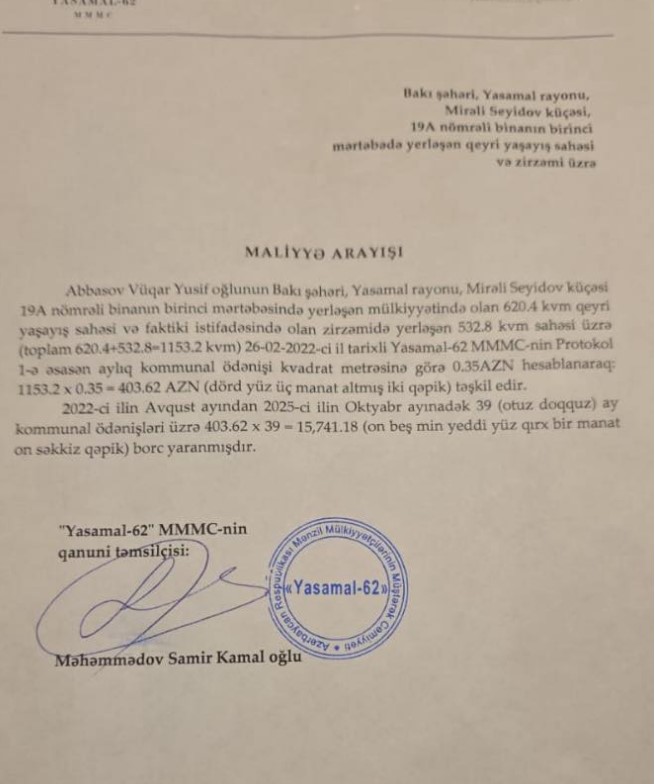 Sənəddə qeyd olunur ki, Abbasov Vüqar Yusif oğluna məxsus, Bakı şəhəri, Yasamal rayonu, Mirəli Seyidov küçəsi 19A ünvanında yerləşən obyekt və zirzəmi sahəsi üzrə uzun müddət kommunal ödənişlər edilməyib. Arayışa görə, 2022-ci ilin avqust ayından 2025-ci ilin oktyabrınadək ümumilikdə 39 ay ərzində kommunal xidmətlərə görə 15 741,18 manat borc yığılıb.
