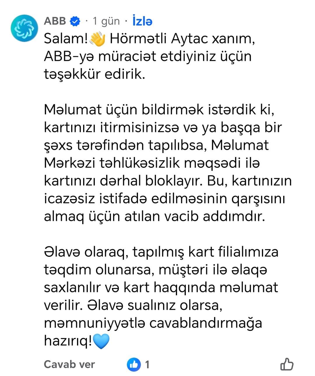 Şikayətini ictimailəşdirən müştərinin problemini ABB cavabsız qoymayıb. Bankdan bildiriblər ki, kart təhlükəsizlik məqsədilə bloklanıb: