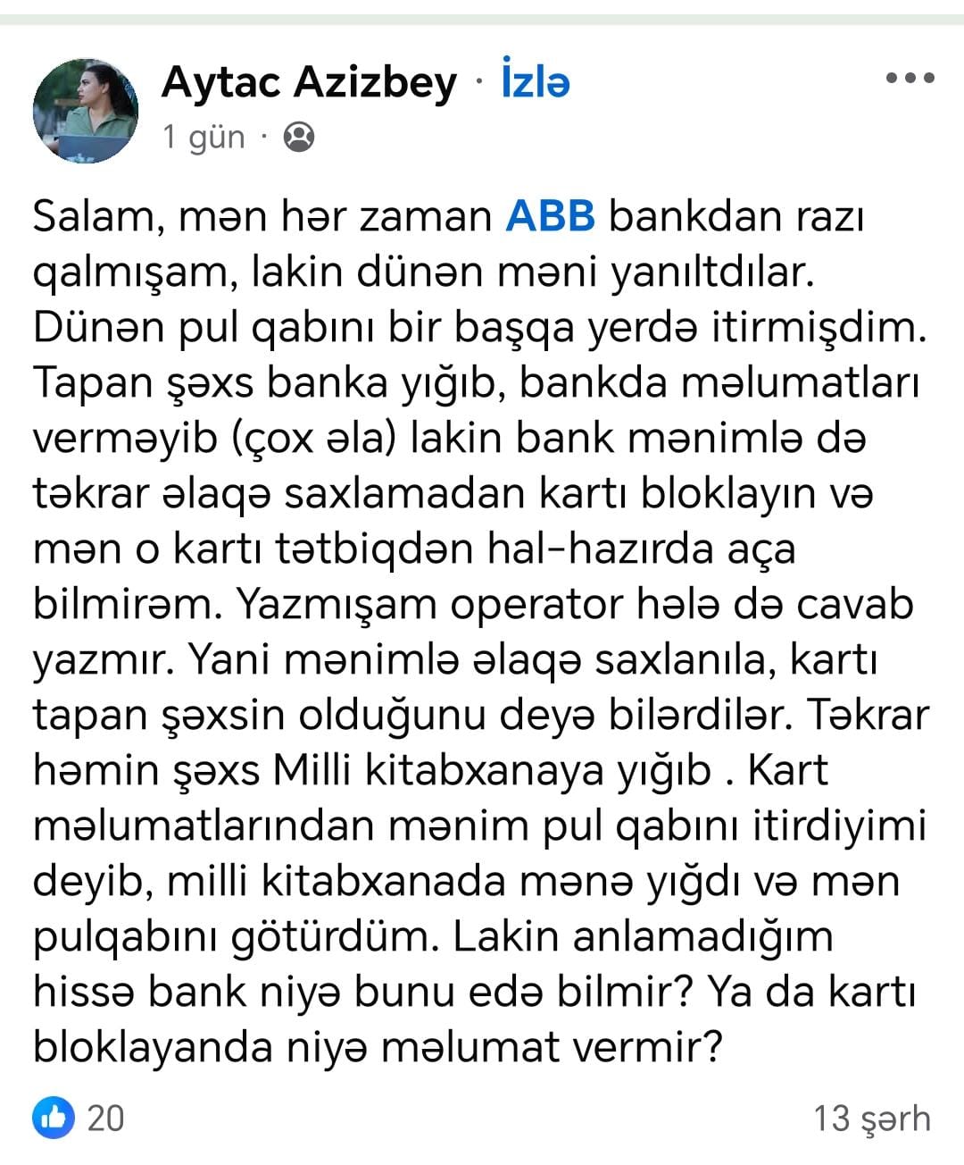 “Dünən pul qabını bir başqa yerdə itirmişdim. Tapan şəxs banka yığıb, bank isə məlumatları verməyib (bu çox əla). Lakin bank mənimlə də təkrar əlaqə saxlamadan kartı bloklayıb və mən o kartı tətbiqdən hal-hazırda aça bilmirəm.