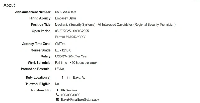 ABŞ-nin Azərbaycandakı səfirliyi yeni vakansiya elan edib.