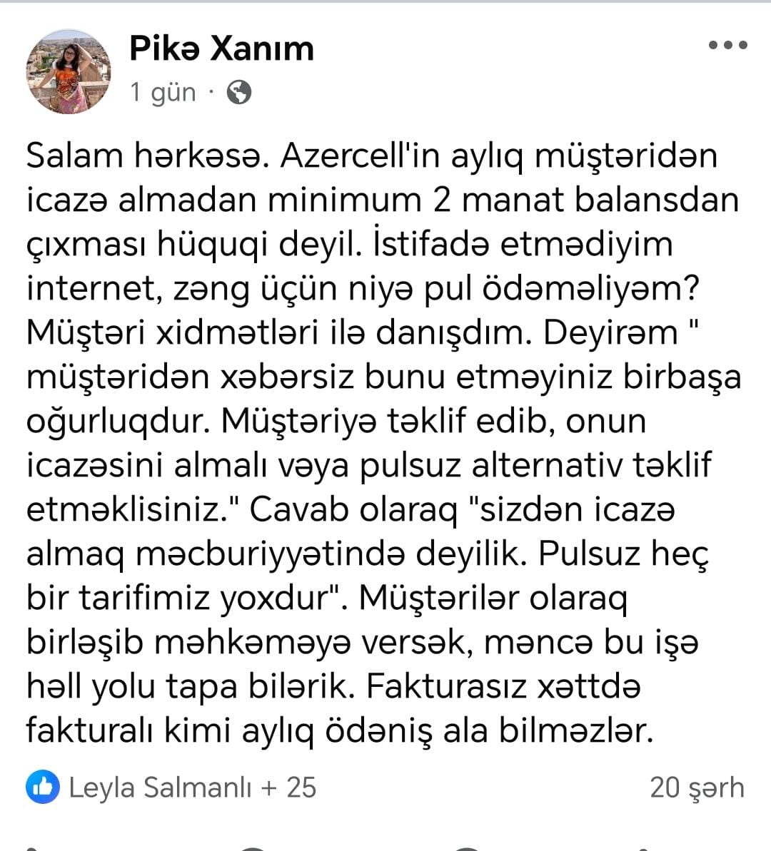 “”Azercell”in aylıq icazə almadan minimum 2 manat balansdan çıxması hüquqi deyil. İstifadə etmədiyim internet, zəng üçün niyə pul ödəməliyəm? Müştəri xidmətləri ilə danışdım. Deyirəm, müştəridən xəbərsiz bunu etməyiniz birbaşa oğurluqdur. Müştəriyə təklif edib, onun icazəsini almalı və ya pulsuz alternativ təklif etməklisiniz. Cavab olaraq mənə deyir ki, sizdən icazə almaq məcburiyyətində deyilik. Deyir, pulsuz heç bir tarifimiz yoxdur.