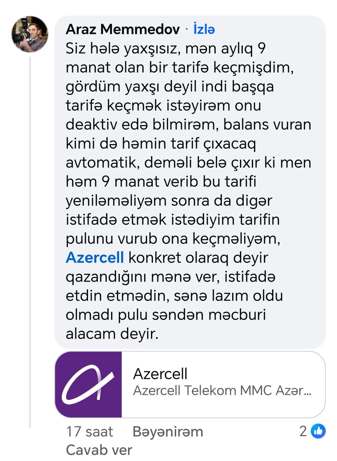 “Mən aylıq 9 manat olan bir tarifə keçmişdim. Gördüm yaxşı deyil, indi başqa tarifə keçmək istəyirəm. Onu deaktiv edə bilmirəm. Balans vuran kimi də həmin tarif çıxacaq avtomatik. Deməli, belə çıxır ki, mən həm 9 manat verib bu tarifi yeniləməliyəm, sonra da digər istifadə etmək istədiyim tarifin pulunu vurub ona keçməliyəm. “Azercell” konkret olaraq deyir ki, qazandığını mənə ver, istifadə etdin-etmədin, sənə lazım oldu-olmadı, pulu səndən məcburi alacam”.