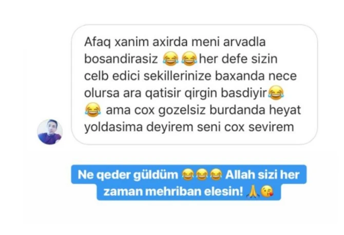 “Afaq xanım, axırda məni arvadla boşandırassınız. Hər dəfə sizin cəlbedici şəkillərinizə baxanda necə olursa ara qarışır, qırğın başlayır. Amma çox gözəlsiniz. Buradan da həyat yoldaşıma deyirəm səni çox sevirəm. İki oğlum var. Arvadım məni boşasa sizi tapıb, aliment pulunu sizdən alacam”./BAKU.WS/