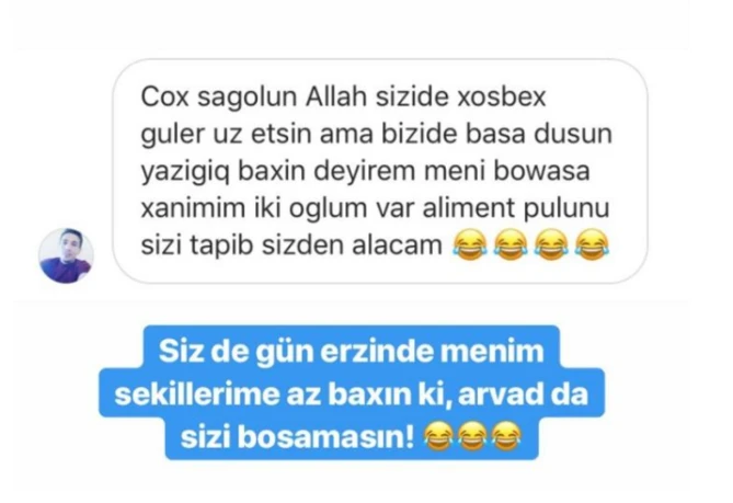 İki uşaq atası ifaçıya ünvanladığı mesajda ona ailə dağıtmaq gücündə olduğunu yazıb:
