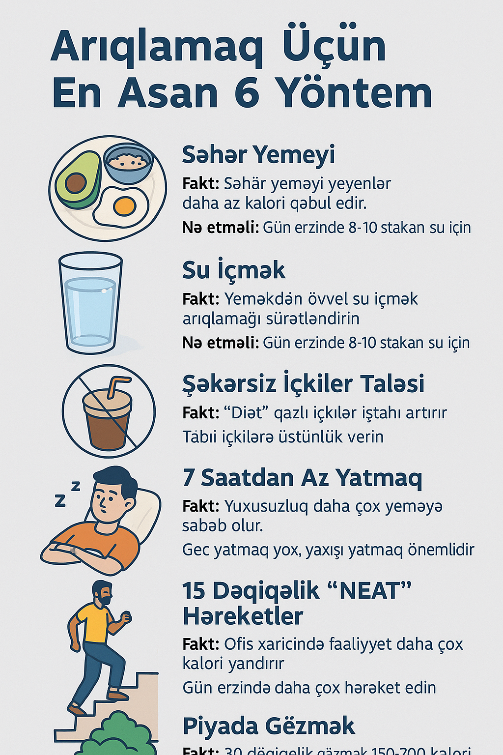 Arıqlamaq ac qalmaq və özünü əziyyətə salmaq demək deyil. Kiçik, davamlı vərdişlər bədəninizin ritmini dəyişə və sağlamlıq yolunda böyük addımlara çevrilə bilər.