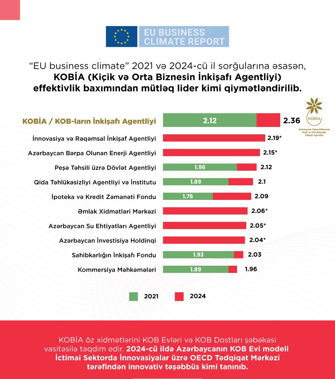 “Kiçik və Orta Biznesin İnkişafı Agentliyi Avropa İttifaqının dəstəyi ilə hazırlanan “EU Business Climate Report: Azerbaijan 2024” hesabatında effektivlik baxımından bütün dövlət qurumları arasında birinci sırada qərarlaşdı”.