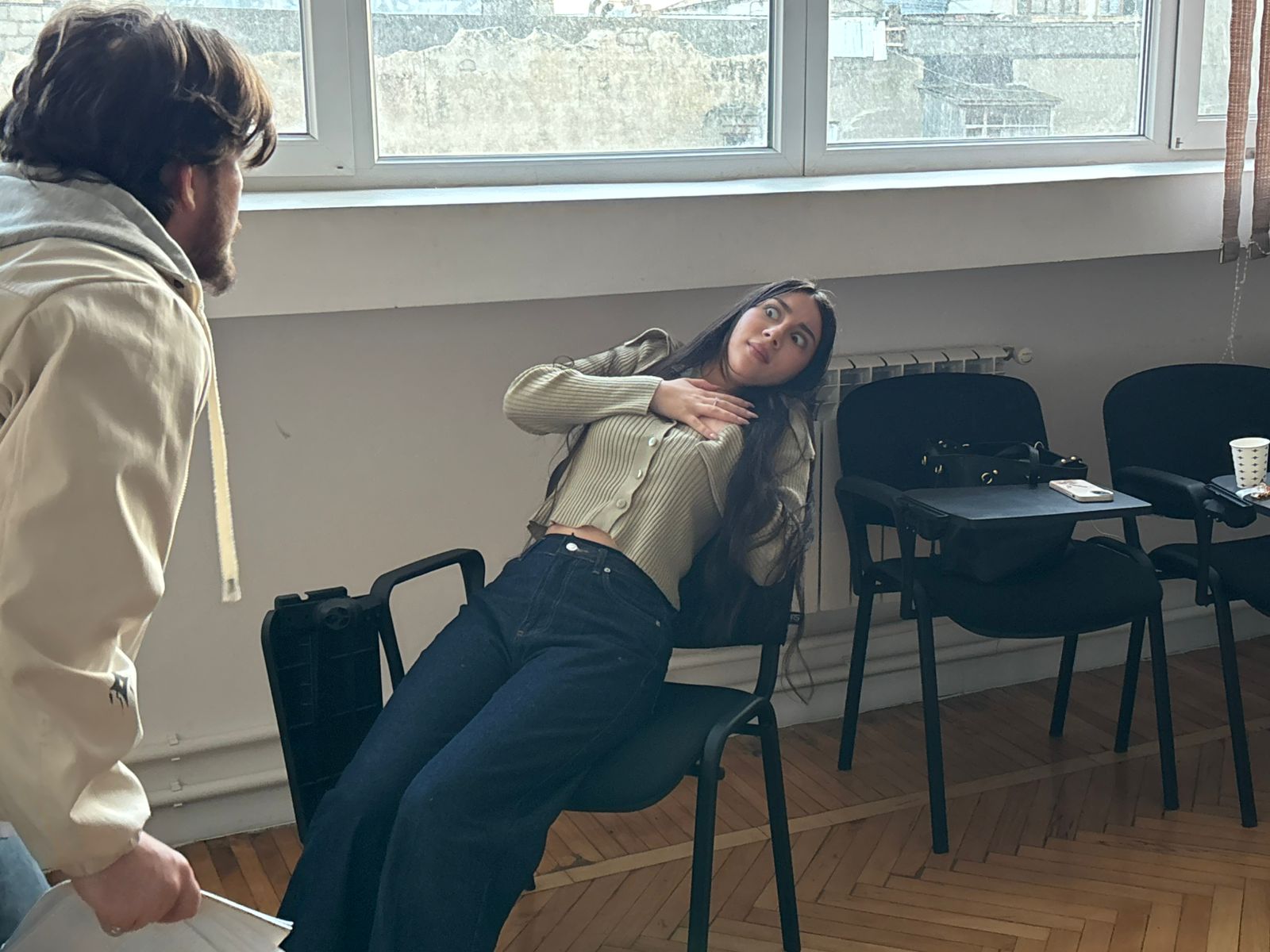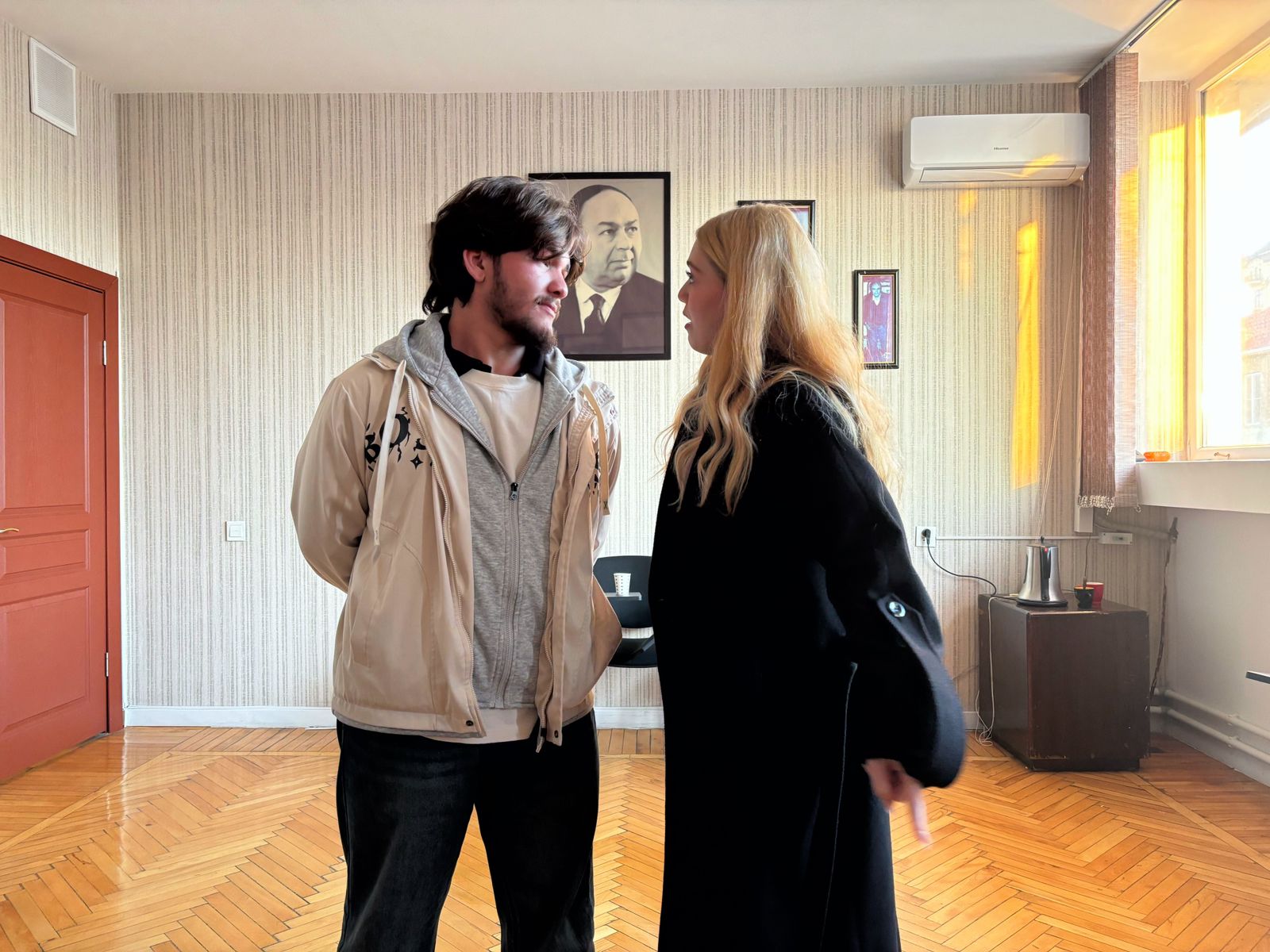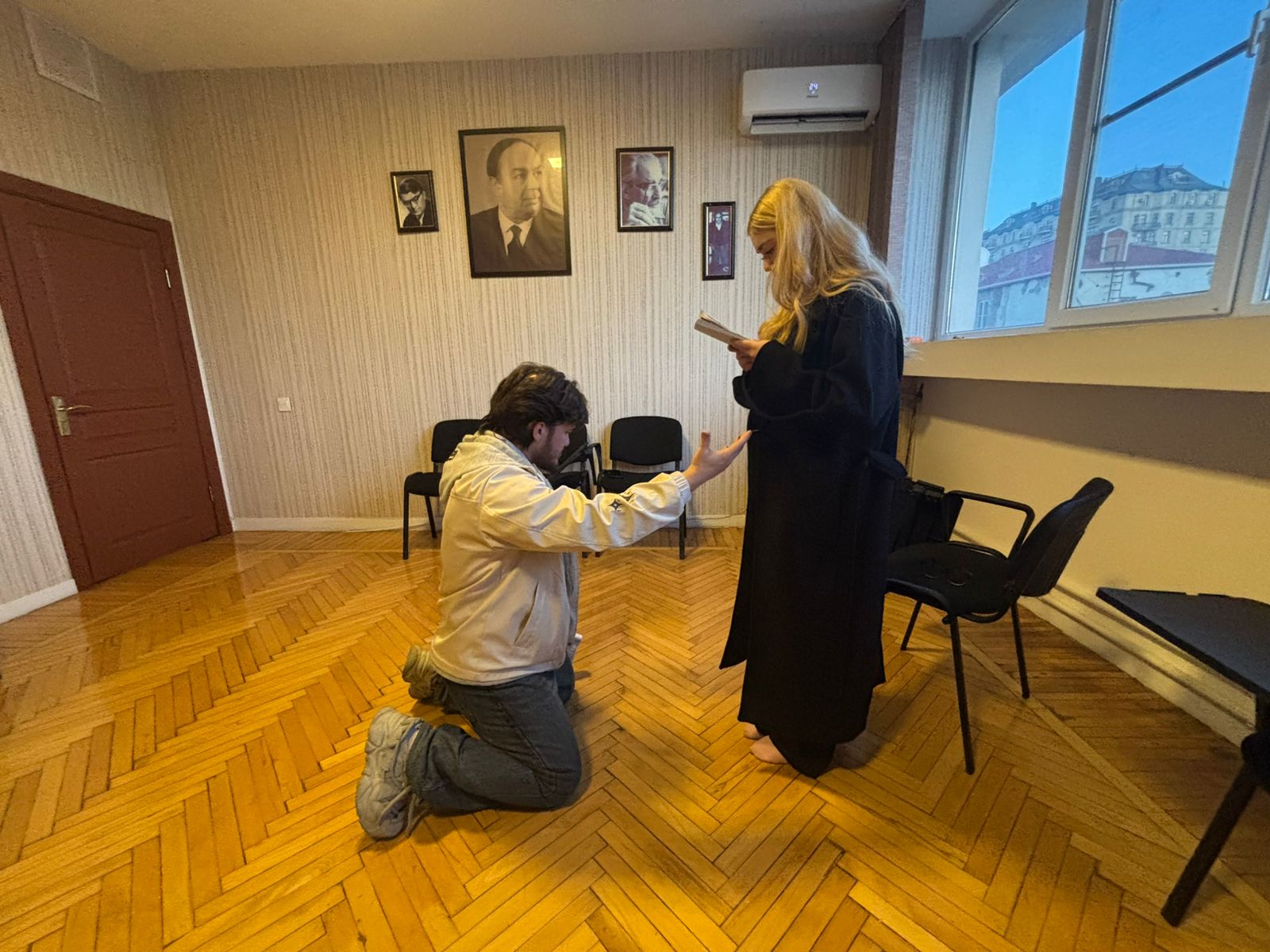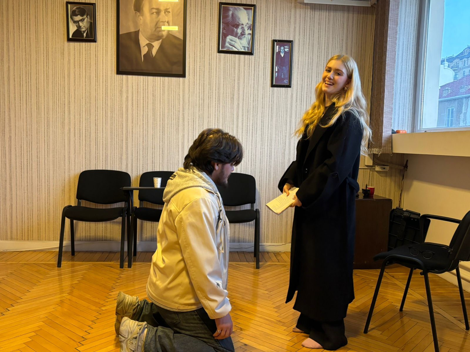 Səhnə əsərində İncəsənət Universitetinin tələbələri Qriqori Stepanoviç Smirnov (Hüseyn Quluzadə), Yelena İvanovna Popova (Türkel Ələsgər), Anfisa (Nərmin Ağayeva) iştirak edirlər.
