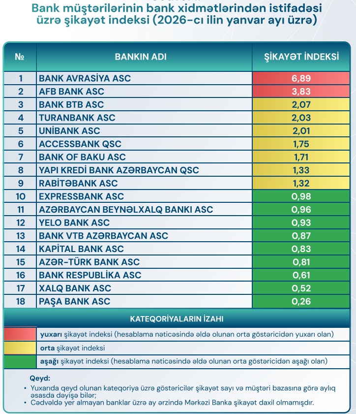 2026-cı ilin yanvar ayında Azərbaycanda ən çox şikayət edilən bank 6.89 indeksi ilə “Bank Avrasiya” seçilib.
