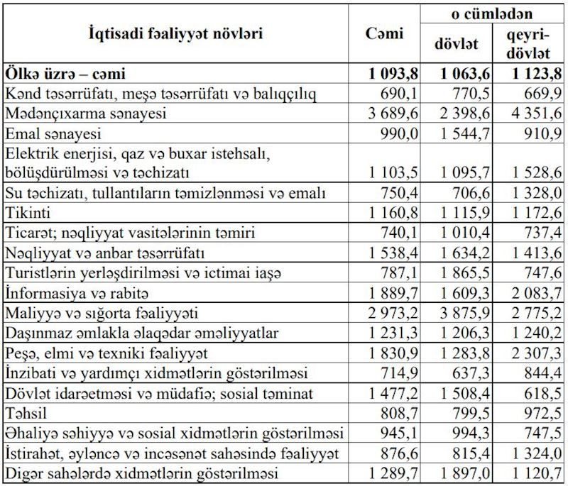 Tribuna.az açıqlanan rəsmi məlumatlara istinadən xəbər verir ki, əməkhaqqı neft-qaz sektorunda 3 849,8 manat, qeyri neft-qaz sektorunda 1 042,6 manat təşkil edib. Dövlət müəssisələrində çalışan işçilərin əməkhaqları 1 063,6 manat, özəl müəssisələrdə isə 1 123,8 manat olub.