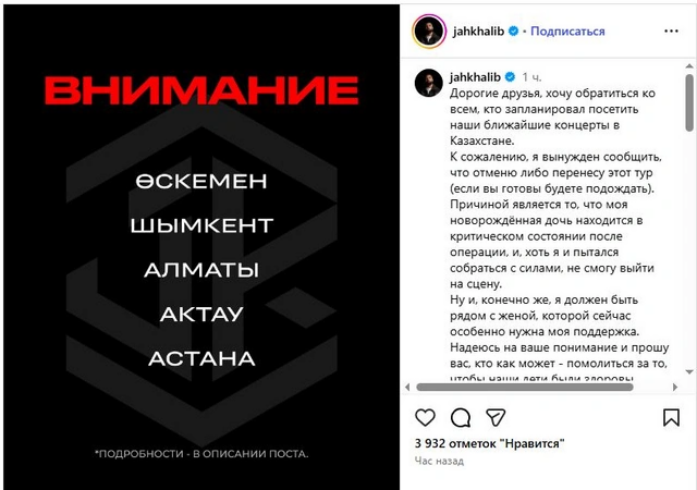 Qazaxıstanın azərbaycanəsilli musiqiçisi Jah Khalib (Bəxtiyar Məmmədov) yaxın günlərdə keçirəcəyi konsertlərini təxirə salıb.