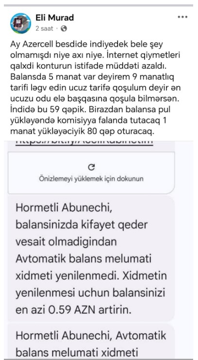 Paylaşımda həmçinin istifadəçiyə “Azercell” tərəfindən göndərilən mesajın skrinşotu da yer alıb. Həmin bildirişdə qeyd olunur ki, balansda kifayət qədər vəsait olmadığından “Avtomatik balans məlumatı” xidməti yenilənməyib. Xidmətin bərpa olunması üçün ən azı 0.59 AZN əlavə yükləmə tələb olunur.