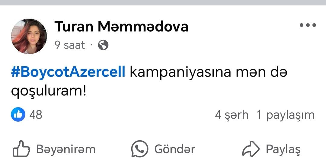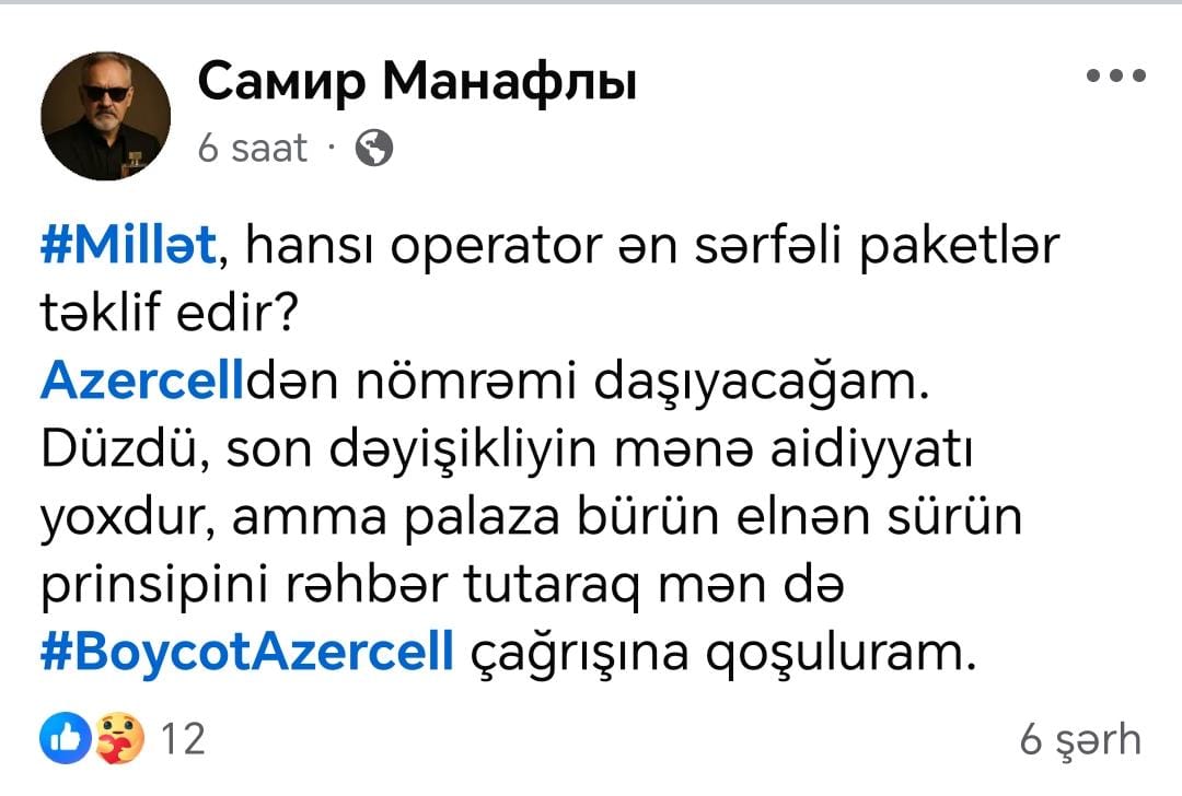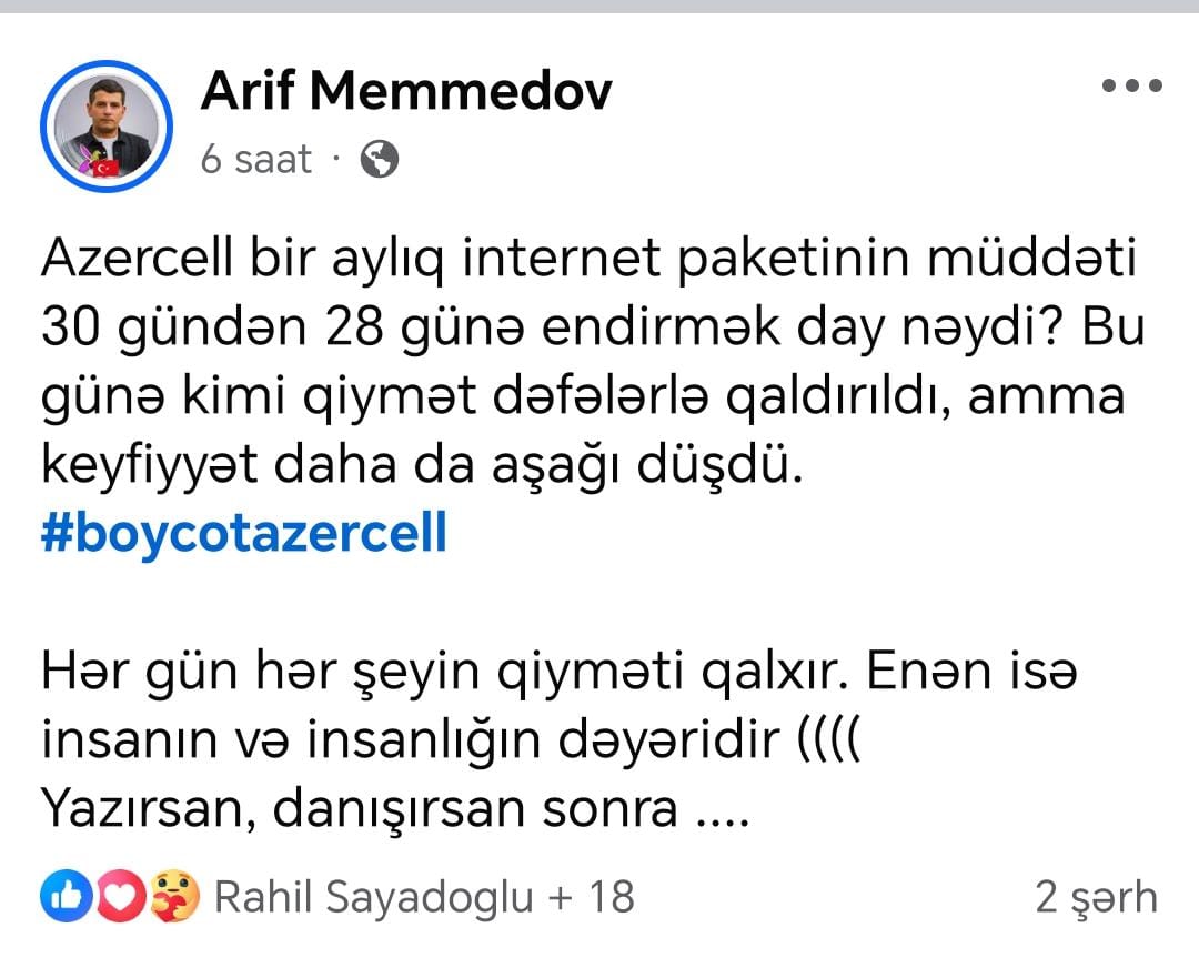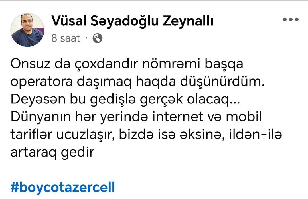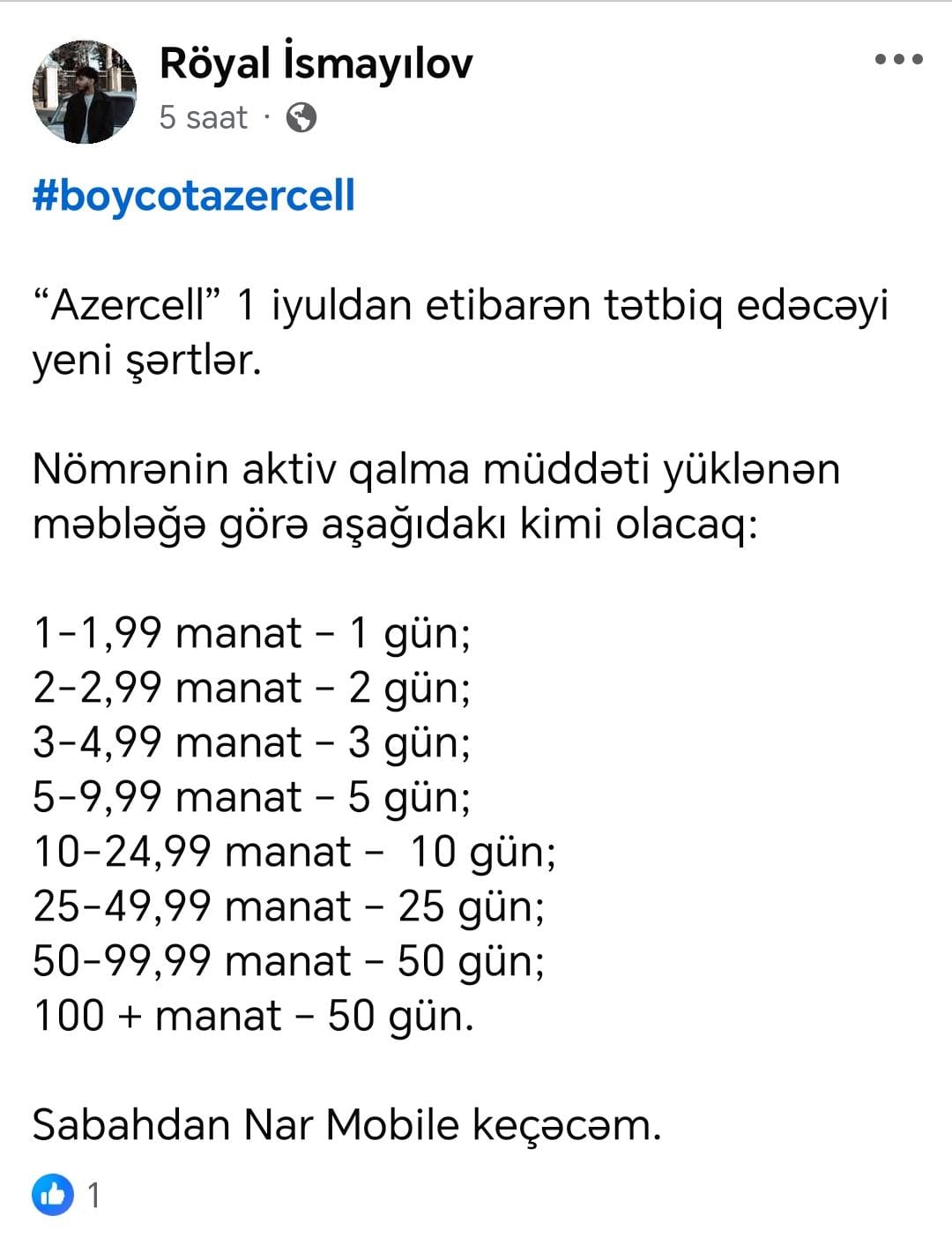 “Azercell”in yeni qərarı abonentlərin narazılığına səbəb olub. Abonentlər sosial şəbəkələrdə #BoycotAzercell haştağı ilə kampaniya başladaraq provayderin yeni qərarına qarşı birləşiblər.