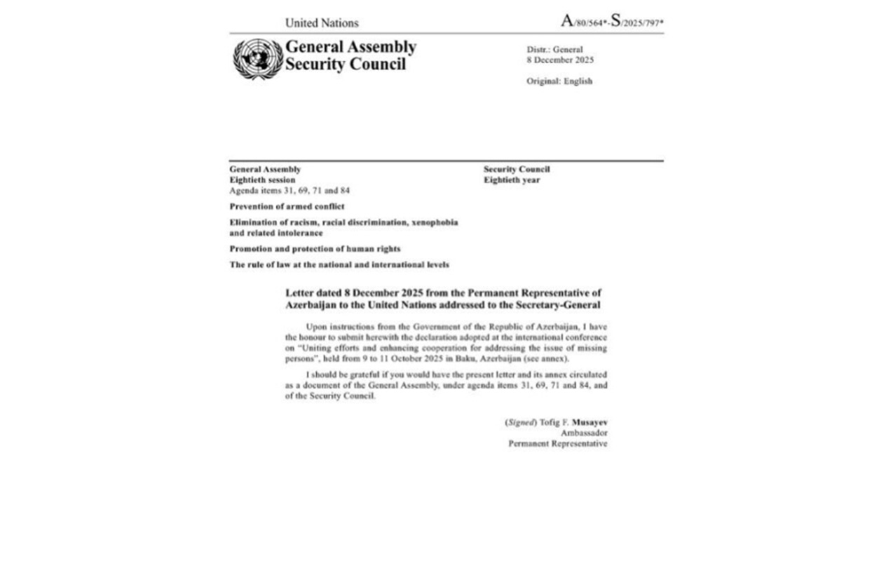 9-11 oktyabr 2025-ci il tarixlərində Bakı şəhərində keçirilən “İtkin düşmüş şəxslər məsələsinin həlli üçün səylərin birləşdirilməsi və əməkdaşlığın gücləndirilməsi” mövzusunda beynəlxalq konfransda qəbul edilmiş bəyannamə BMT Baş Assambleyasının və Təhlükəsizlik Şurasının rəsmi sənədi kimi dərc olunub və yayılıb.