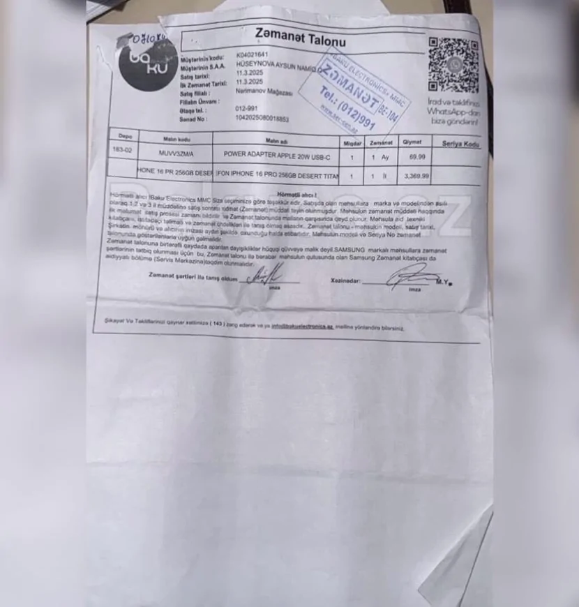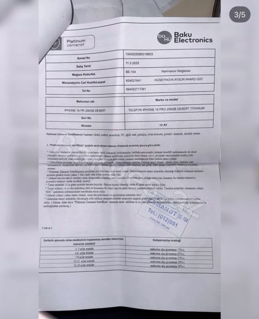 Şikayətçinin sözlərinə görə, telefonu 2 ay istifadə etdikdən sonra zavod qüsuru aşkarlanıb və mart ayında yeni telefonla əvəz edilib. Yeni telefon təqdim edilərkən yenidən “qızıl zəmanət istəyirsiniz?” sualı verilib və o, yenidən bu təklifə razılıq verib.