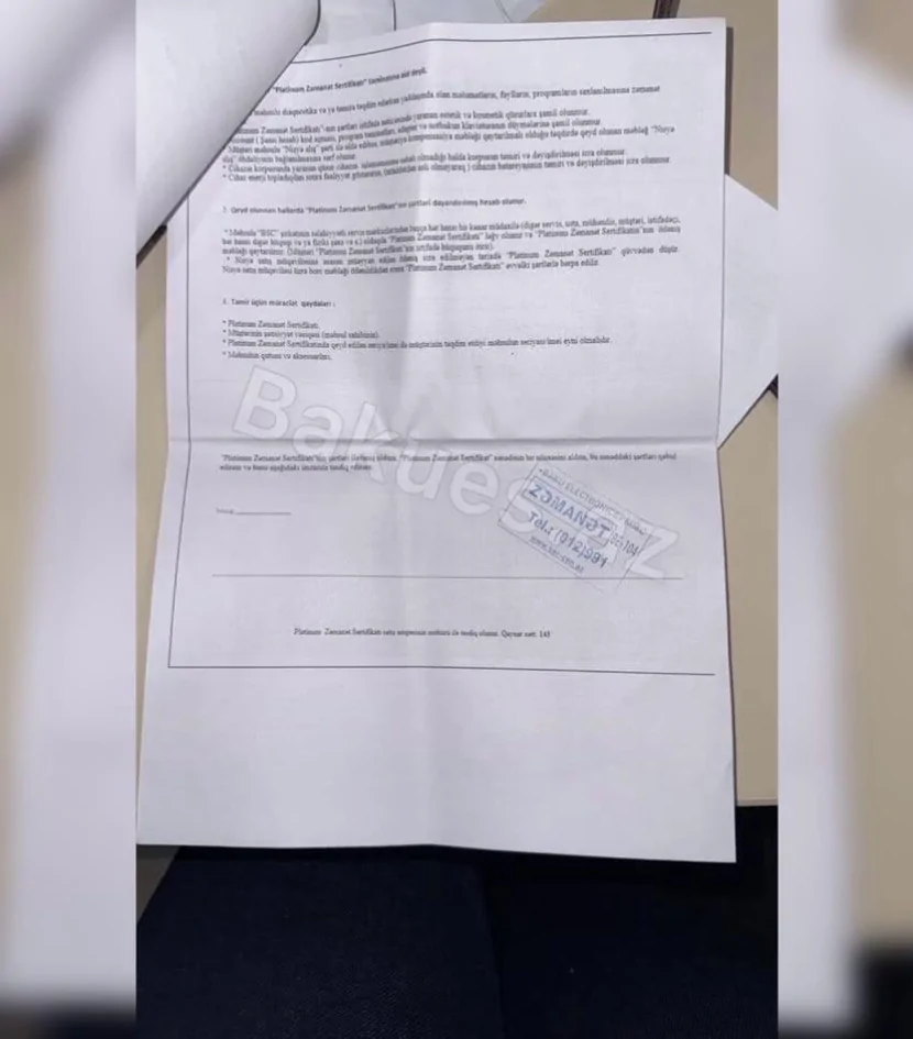 “Müdiriyyət nümayəndəsi Elçin Qəniyev dəfələrlə “qızıl zəmanətiniz var” deyib, lakin daha sonra bunun “platinum zəmanət” olduğu bildirilib. Halbuki müqavilə bağlanarkən mənə “platinum zəmanət” yox, məhz “qızıl zəmanət” deyilib”, – deyə müştəri əlavə edib.
