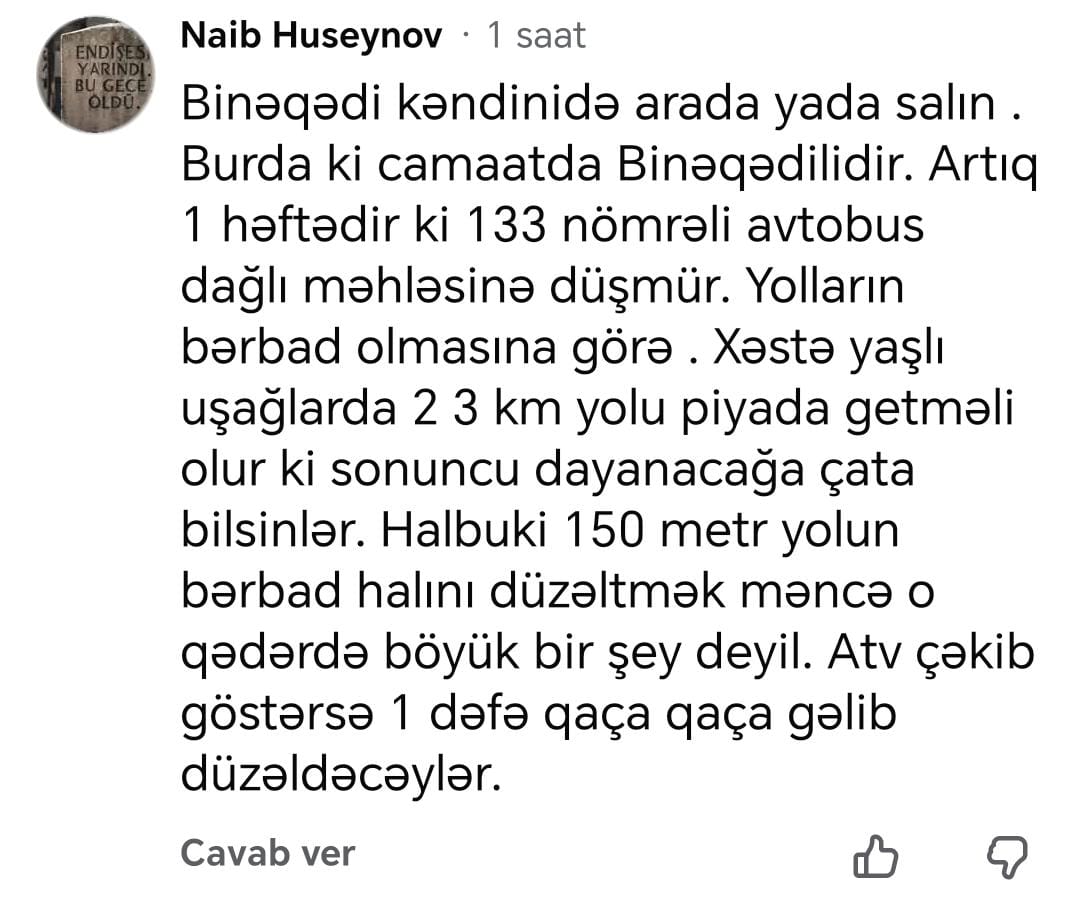 “Binəqədi kəndini də arada yada salın. Burada yaşayanlar da binəqədilidi. Bir həftədir bu əraziyə avtobus gəlmir yolun bərbad olmasına görə. Xəstəsi, yaşlısı, uşağı – 2-3 km yolu piyada getməli olur. 150 metrlik yoldu. Bunu düzəltmək nə çətin işdir ki?”.
