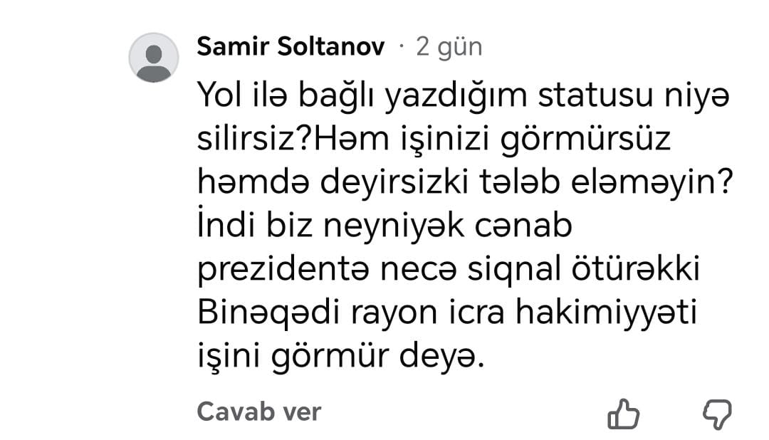 “Yol ilə bağlı yazdığım şikayəti niyə silirsiniz? Həm işinizi görmürsünüz, həm də deyirsiz ki, heç nə tələb etməyin? İndi biz nə edək, prezidentə necə məlumat verək ki, Binəqədi rayon İcra Hakimiyyəti işini görmür”.