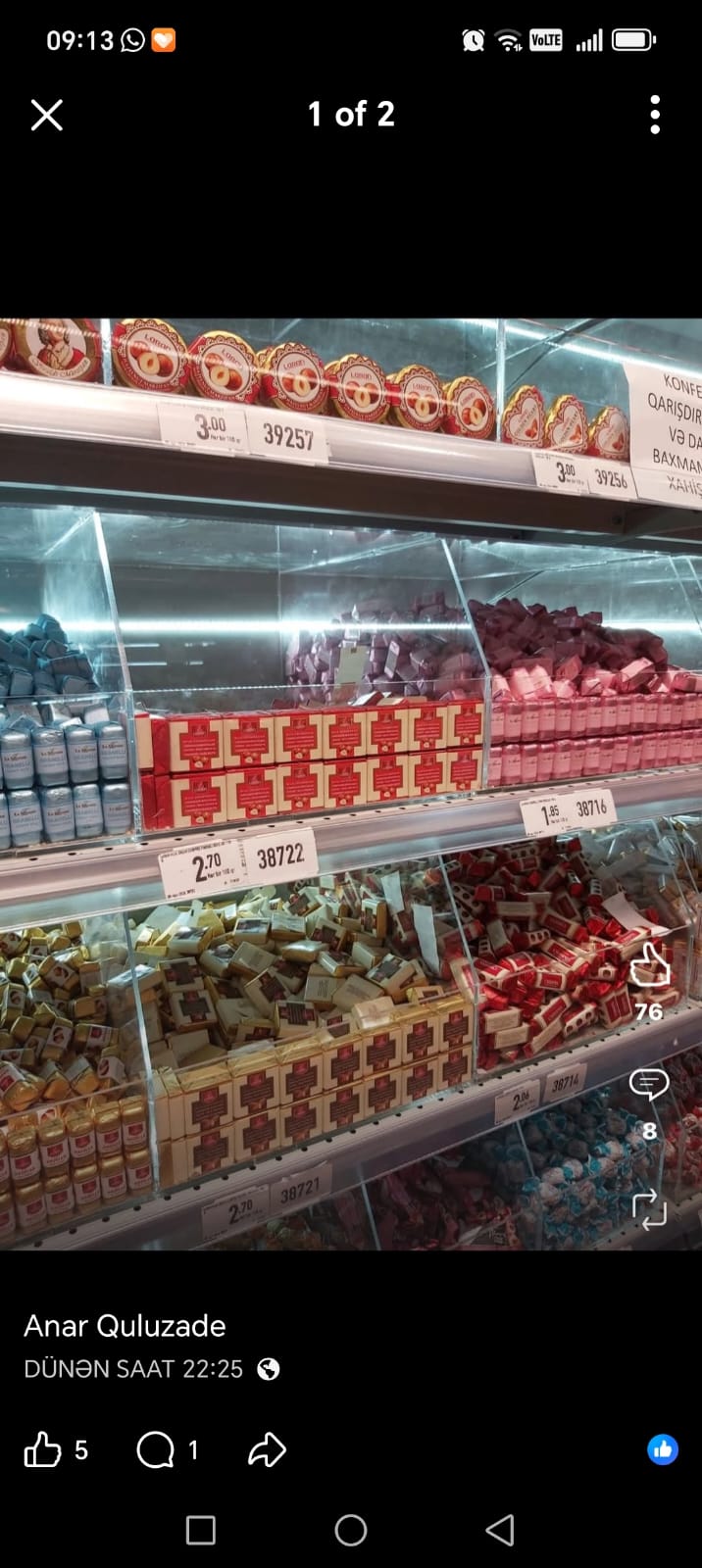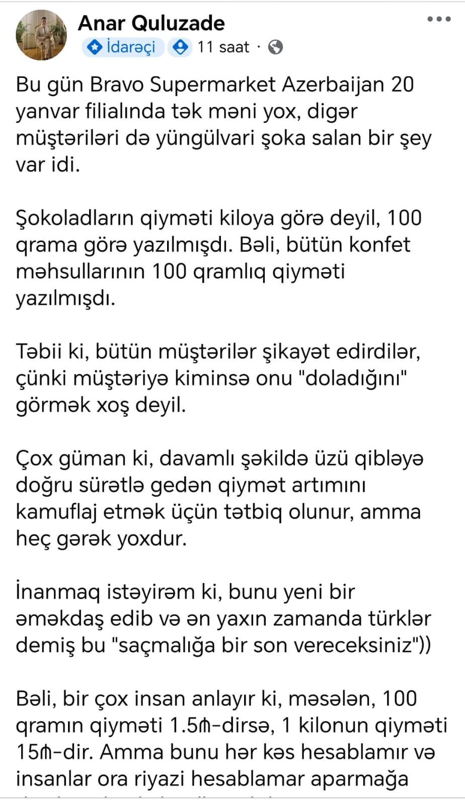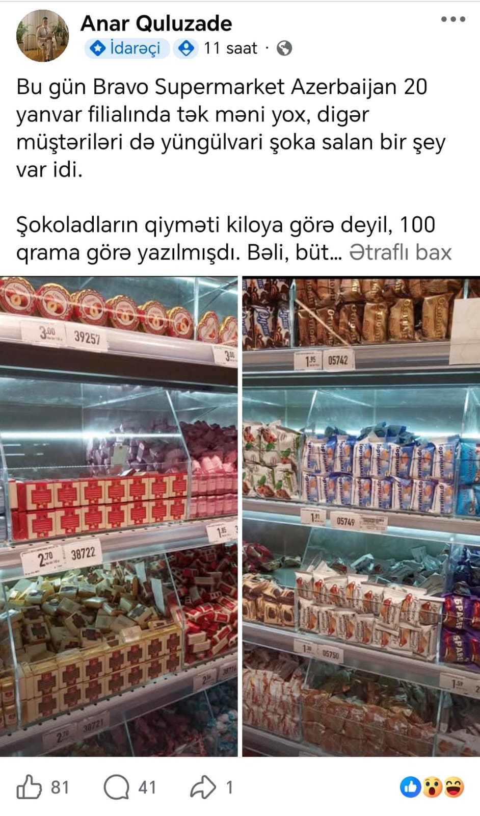 Tribuna.az xəbər verir ki, şikayətçi Anar Quluzadənin sözlərinə görə, marketdə satışda olan şokolad və konfet məhsullarının qiymətləri kiloqram üzrə deyil, 100 qram üzrə göstərilib. Bu isə alıcıların ciddi narazılığına səbəb olub.
