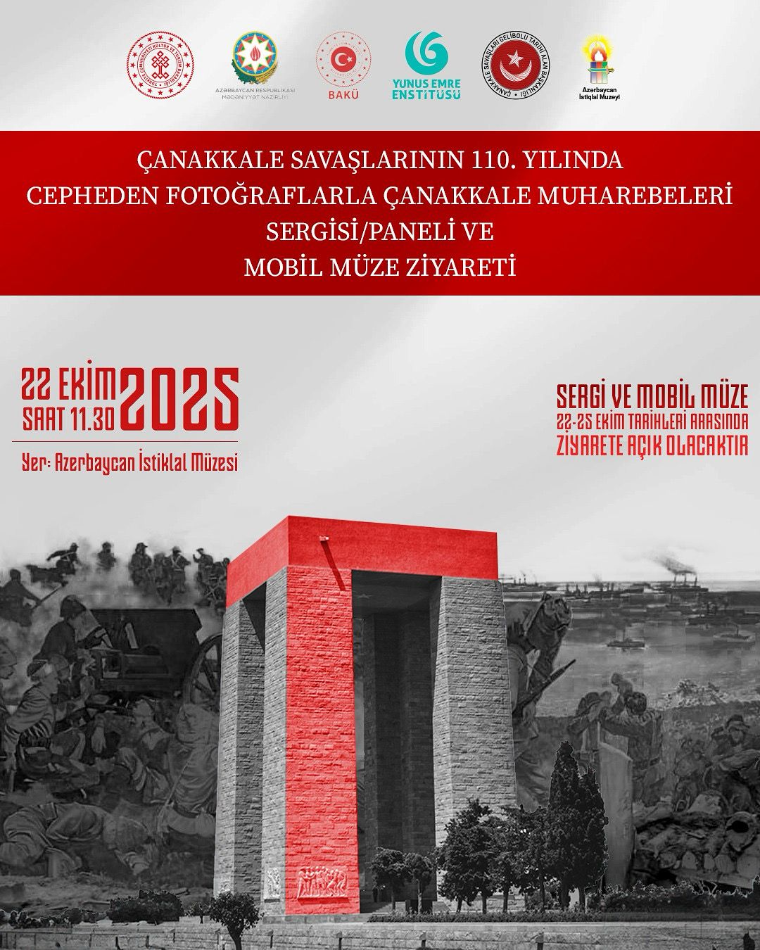 Bakı Yunus Emre İnstitutunun və Azərbaycan İstiqlal Muzeyinin birgə əməkdaşlığı, Azərbaycan Mədəniyyət Nazirliyi, Türkiyə Mədəniyyət və Turizm Nazirliyi, Türkiyənin Azərbaycandakı Səfirliyi və Çanaqqala Döyüşləri Gelibolu Tarixi Ərazi İdarəsinin dəstəyi ilə Çanaqqala Döyüşlərinin 110-cu ildönümü münasibətiylə 22 oktyabr 2025-ci il tarixində saat 11.30-da Azərbaycan İstiqlal Muzeyində “Cəbhədən Fotolarla Çanaqqala Döyüşləri” adlı sərgi və panel proqramı keçiriləcəkdir.