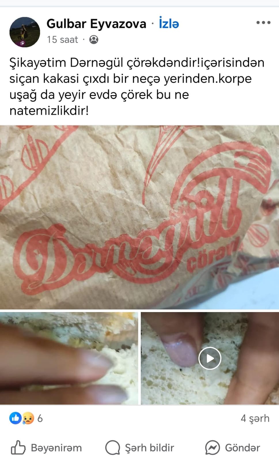 “Şikayətim “Dərnəgül” çörəkdəndir! İçərisindən siçan nəcisi çıxdı, həm də bir neçə yerindən. Körpə uşaq da yeyir evdə bu çörəkdən. Bu nə natəmizlikdir”.