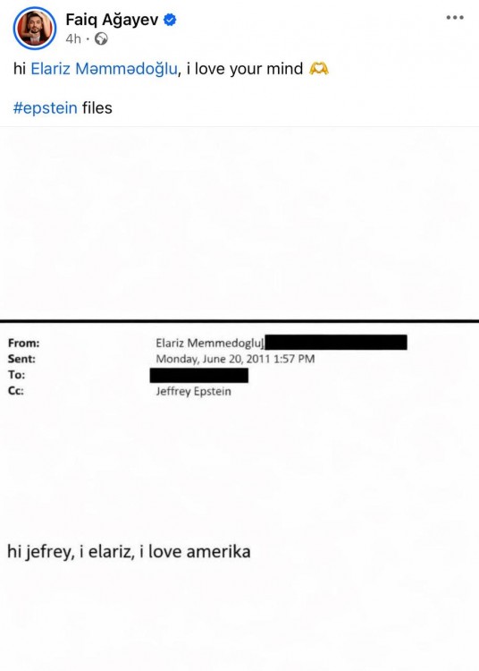 Paylaşımda Elarizin onlarla azyaşlı qızın istismar edildiyi şəbəkə ilə bağlı ittiham olunan milyarder Ceffri Epşteynə yazdığı elektron məktub yer alıb. Məktub 2011-ci ilə aid olub.