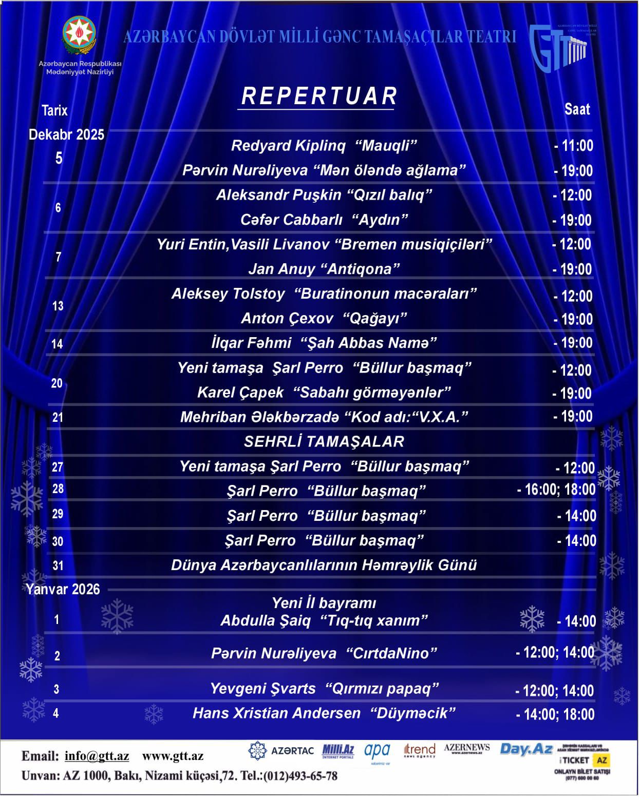 Azərbaycan Dövlət Gənc Tamaşaçılar Teatrının dekabr repertuarı maraqlı tamaşalarla zəngindir.