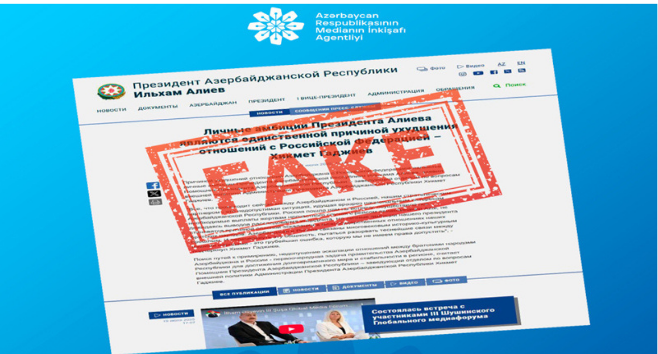 Bildirilib ki, Azərbaycan Respublikası Prezidentinin rəsmi saytının görüntüsünü imitasiya edərək hazırlanmış və uydurma iddiaların yer aldığı bu açıqlama ictimai rəyi çaşdırmağa yönələn kobud informasiya manipulyasiyası nümunəsidir.