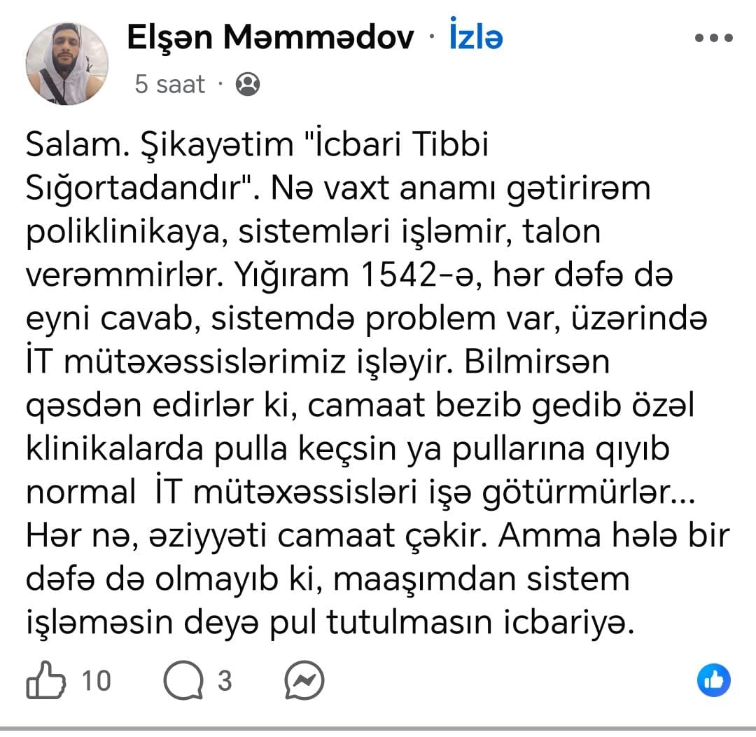 Tribuna.az xəbər verir ki, paytaxt sakini Elşən Məmmədov İcbari Tibbi Sığorta istemindən narazı olduğunu bildirib. Şikayətçi qeyd edib ki, bu sistemə görə dəfələrlə problemlə üzləşib: