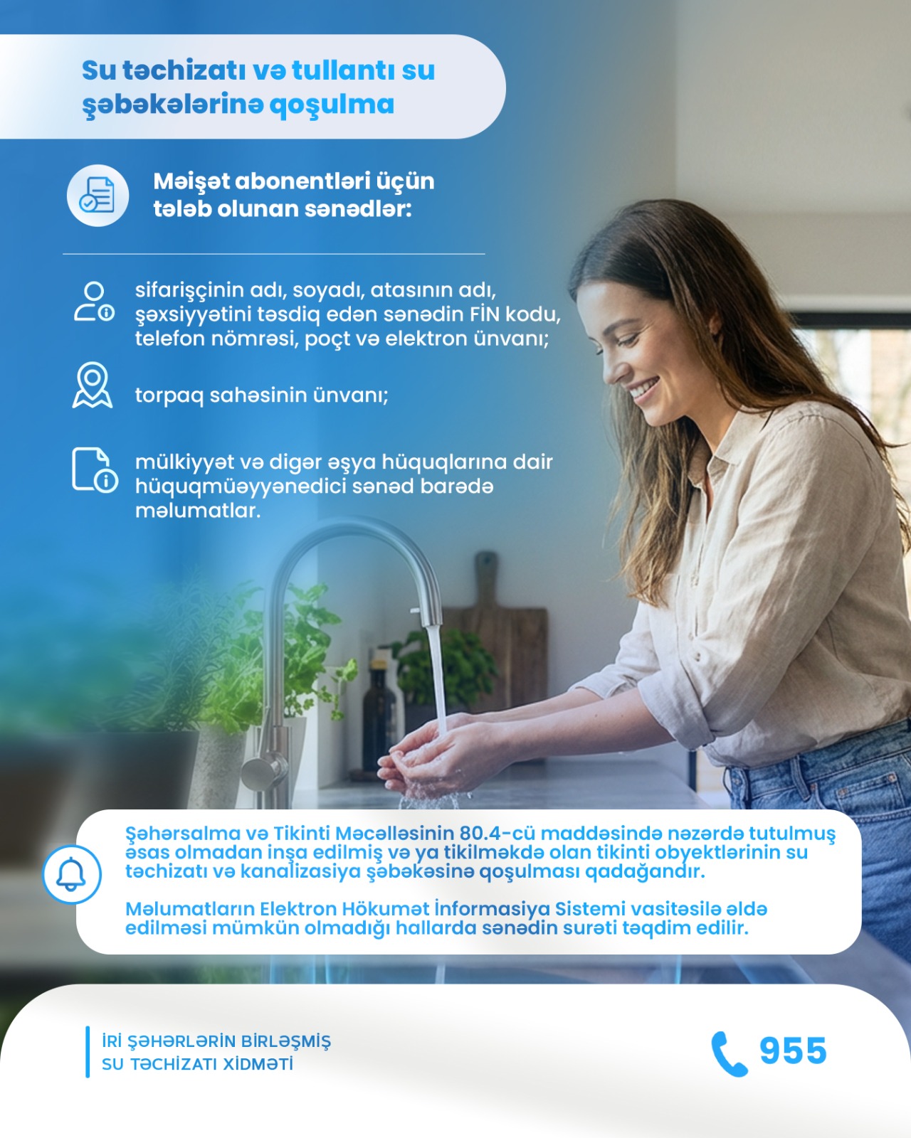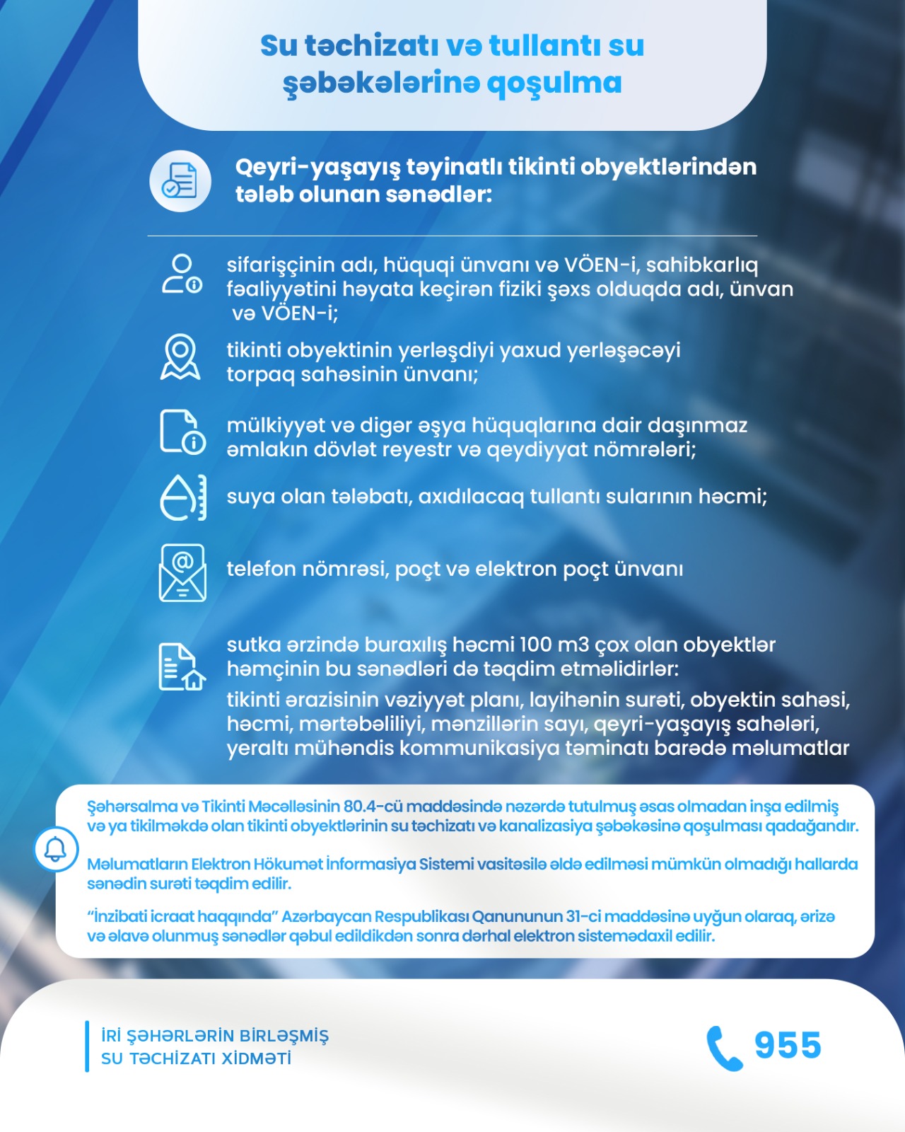 Bu dəfə təqdim etdiyimiz məlumatda su təchizatı və tullantı sularının axıdılması sisteminə qoşulma üzrə tələb olunan sənədlərin siyahısı ilə tanış ola bilərsiniz.
