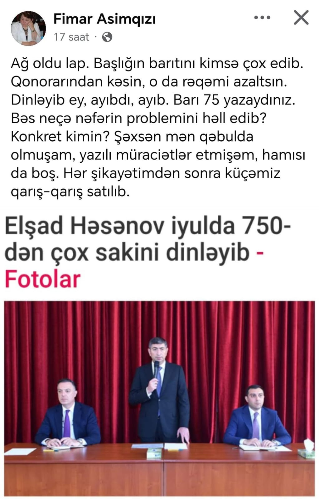 Tribuna.az xəbər verir ki, rayon sakini, jurnalist Fimar Asımqızı paylaşımında bildirib ki, sadəcə insanları dinləməklə məsələ həll olunmur, əsas olan konkret nəticələrdir: