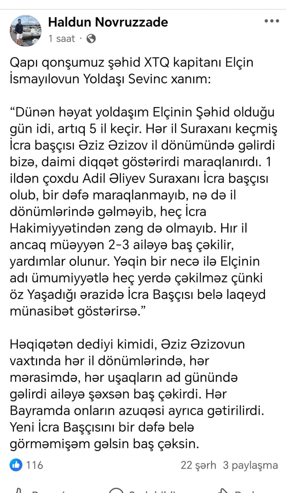 “Dünən həyat yoldaşım Elçinin Şəhid olduğu gün idi, artıq 5 il keçir. Hər il Suraxanı keçmiş İcra başçısı Əziz Əzizov il dönümündə gəlirdi bizə, daimi diqqət göstərirdi, maraqlanırdı. 1 ildən çoxdur Adil Əliyev Suraxanı icra başçısı olub, bir dəfə maraqlanmayıb, nə də il dönümlərində gəlməyib, heç İcra Hakimiyyətindən zəng də olmayıb.