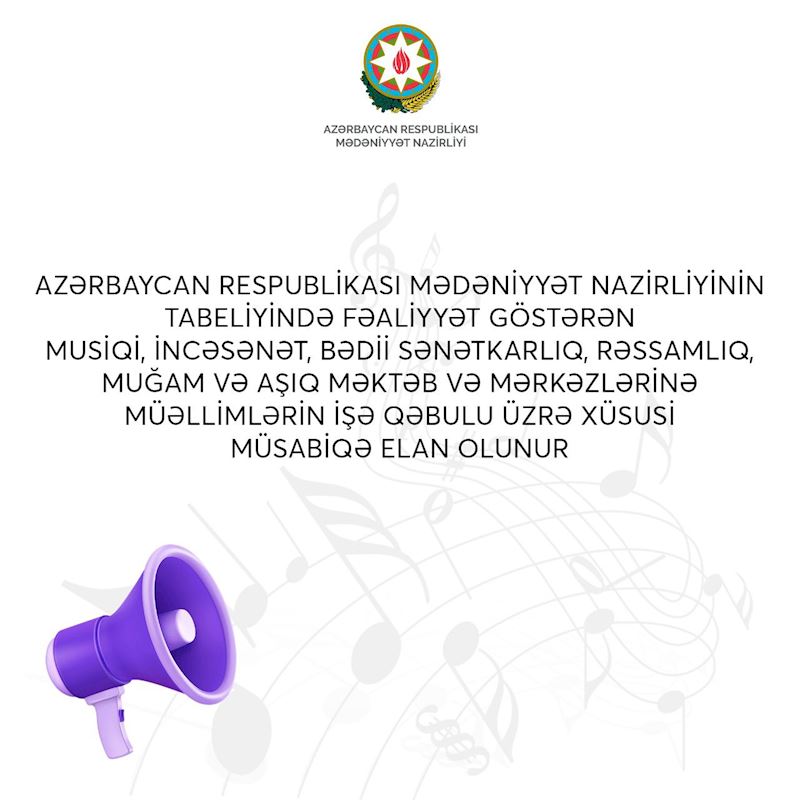Musiqi, incəsənət, rəssamlıq, muğam, aşıq məktəb və mərkəzlərinə direktorların, direktor müavinlərinin və müəllimlərin işə qəbulu Azərbaycan Respublikası Mədəniyyət Nazirliyinin 2024-cü il 5 aprel tarixli 3-24/3-1-f-84/2024 nömrəli əmri ilə təsdiq edilmiş “Azərbaycan Respublikasının Mədəniyyət Nazirliyi tərəfindən musiqi, incəsənət, rəssamlıq, muğam, aşıq məktəb və mərkəzlərinə müəllimlərin işə qəbulu və yerdəyişməsi Qaydaları”nın tələblərinə müvafiq olaraq aparılır.