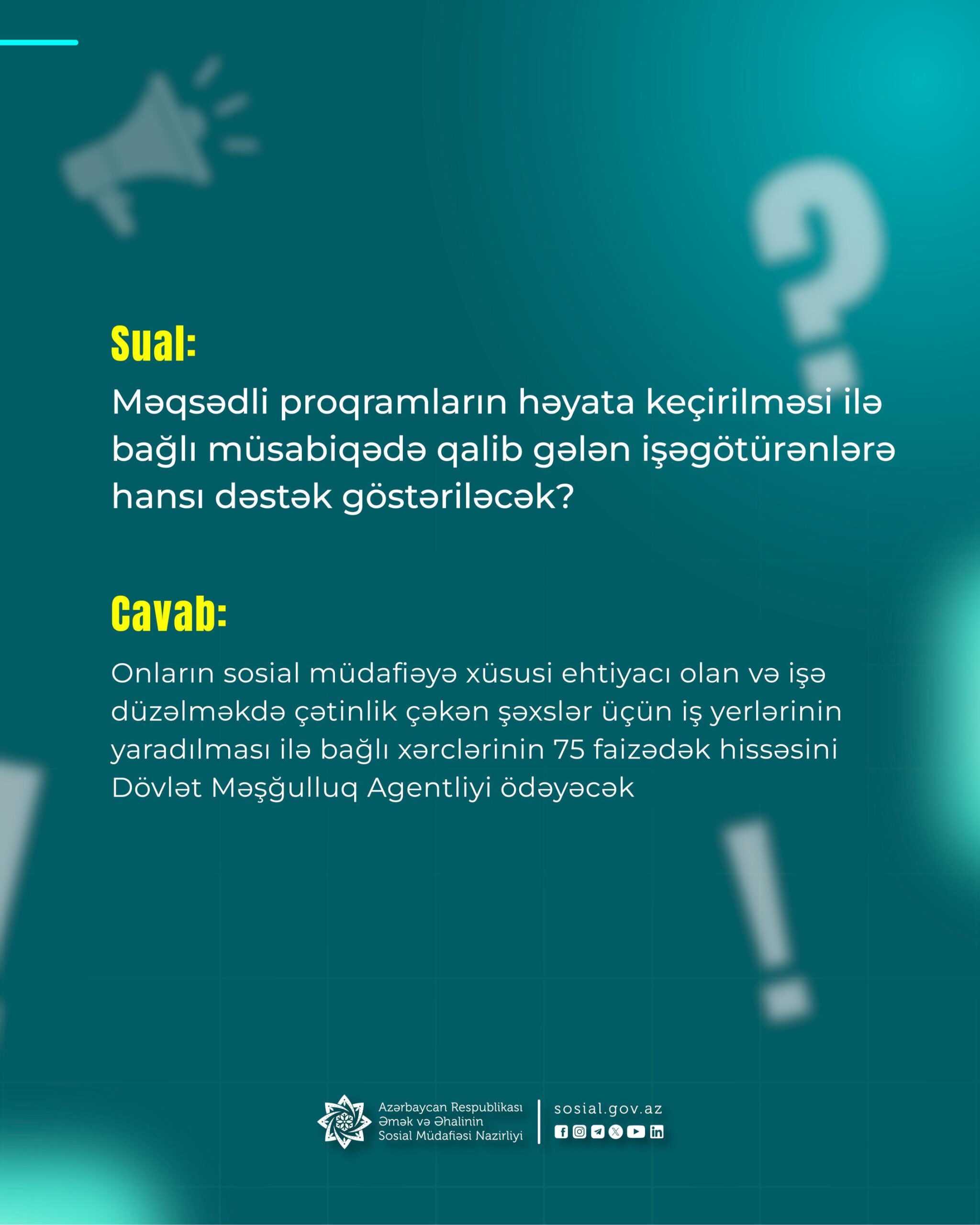 Müsabiqədə qalib gələn işəgötürənlərin sosial müdafiəyə xüsusi ehtiyacı olan və işə düzəlməkdə çətinlik çəkən şəxslər üçün iş yerlərinin yaradılması ilə bağlı xərclərinin 75 faizədək hissəsi Dövlət Məşğulluq Agentliyi tərəfindən, azı 25 faizi isə işəgötürən tərəfindən ödəniləcək.