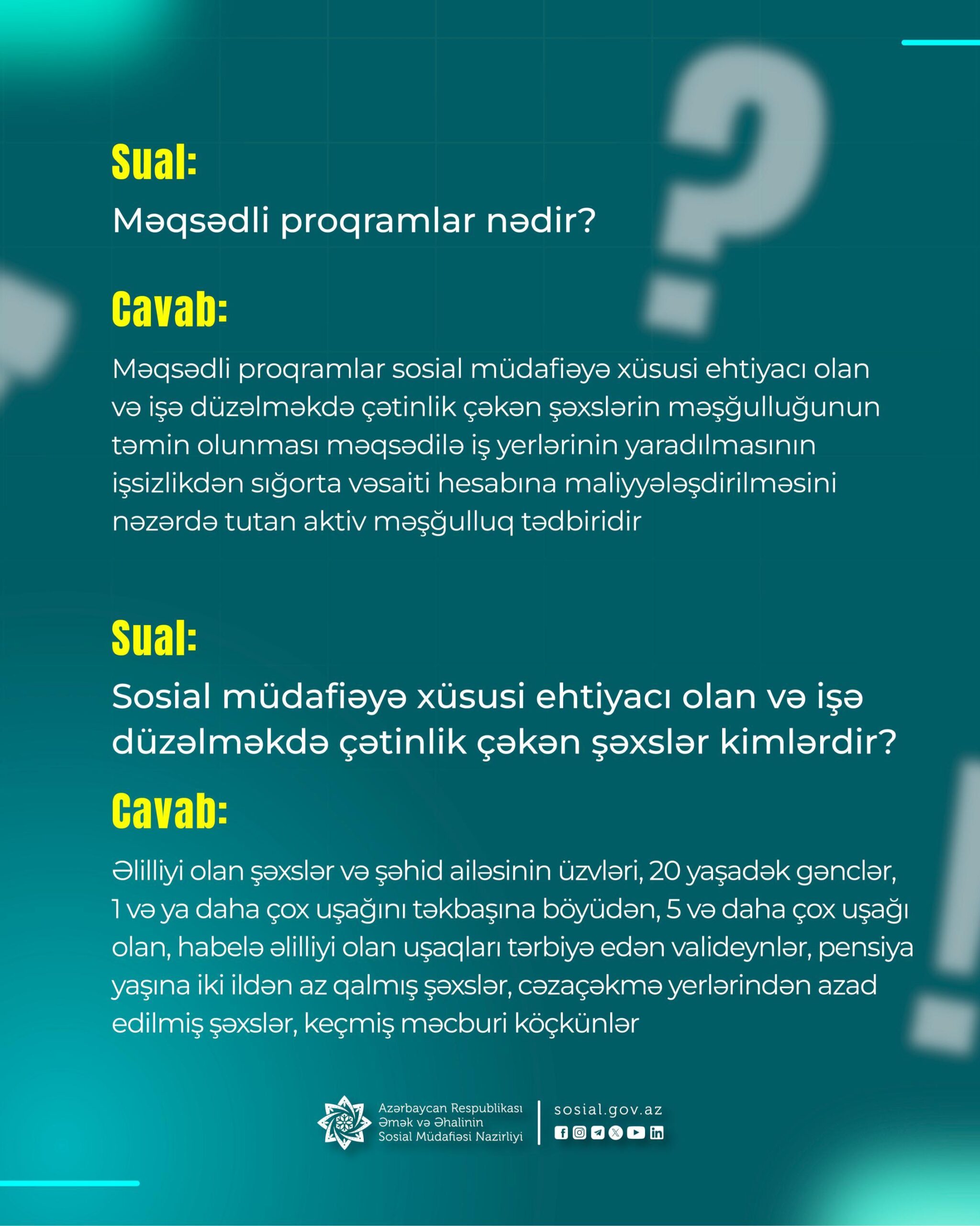 Tribuna.az xəbər verir ki, sosial müdafiəyə xüsusi ehtiyacı olan və işə düzəlməkdə çətinlik çəkən şəxslər kateqoriyasına əlilliyi olan şəxslər, şəhid ailəsinin üzvləri, 20 yaşadək gənclər, 1 və ya daha çox uşağını təkbaşına böyüdən, 5 və daha artıq uşağı olan, habelə əlilliyi olan uşaqları tərbiyə edən valideynlər, pensiya yaşına iki ildən az qalmış şəxslər, cəzaçəkmə yerlərindən azad edilmiş şəxslər, keçmiş məcburi köçkünlər daxildir.