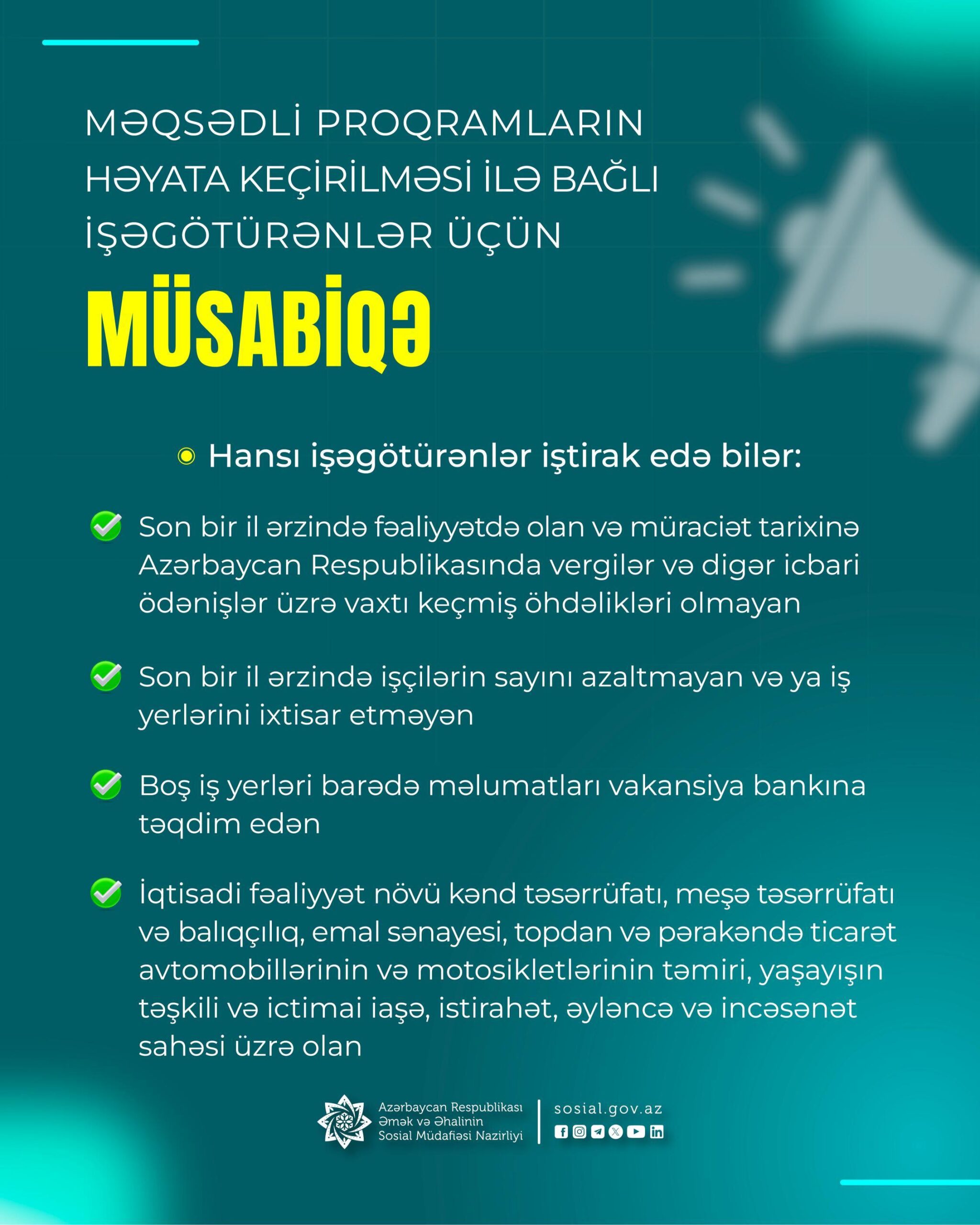 Əmək və Əhalinin Sosial Müdafiəsi Nazirliyinin tabeliyində Dövlət Məşğulluq Agentliyi sosial müdafiəyə xüsusi ehtiyacı olan və işə düzəlməkdə çətinlik çəkən şəxslərin məşğulluğunun təminatına xidmət edən məqsədli proqramların həyata keçirilməsi ilə bağlı işəgötürənlər üçün müsabiqə elan edir.
