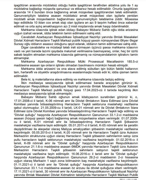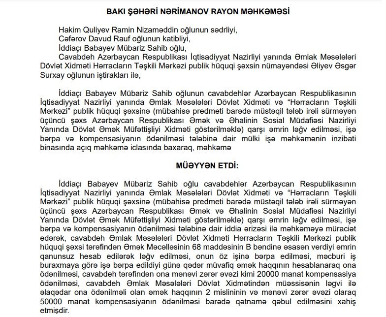 Mübariz Babayevin sözlərinə görə, Hərracların Təşkili Mərkəzi Publik Hüquqi Şəxsin 1 saylı zona bölməsində baş mütəxəssis vəzifəsində çalışıb, lakin 2021-ci ilin noyabrında əsassız yerə işdən çıxarılıb. Bu qərarla razılaşmayan Babayev hüquqi müstəvidə mübarizə apararaq məhkəməyə müraciət edib: