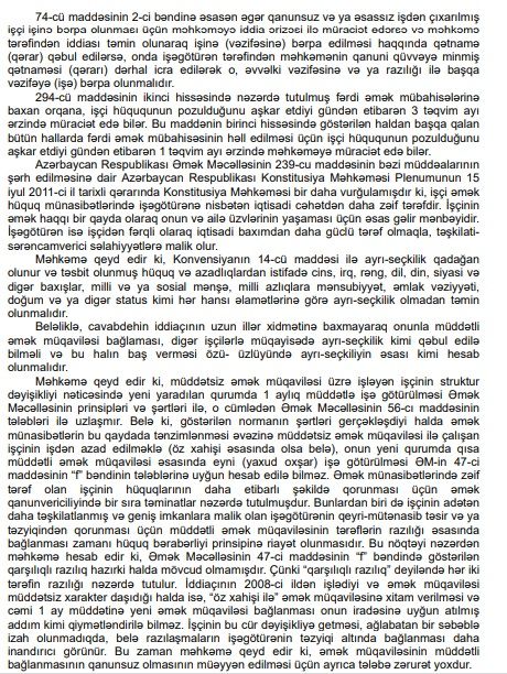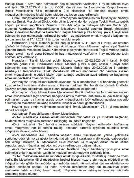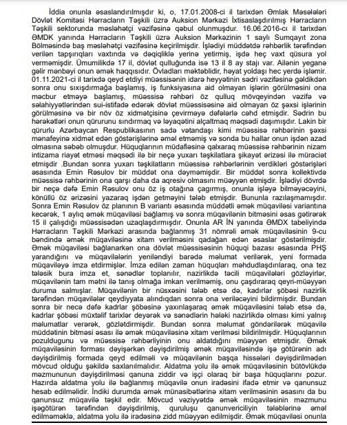 “Mən 17 il bu qurumda müxtəlif vəzifələrdə işləmişəm. Sonra mənə dedilər ki, müqavilənin müddəti bitib. Beləliklə, məni işdən çıxardılar. 2 ildən artıq müddətdir ki, işsizəm, uşaqlarım evdə ac qalıb. Məkhəməyə müraciət etdim və işə ədalətli baxıldı, vəzifəmə qaytarılmağıma bağlı qərar çıxarıldı. Lakin 10 aydır ki, bu qərar icra olunmur. Deyirlər ki, sənin vəzifən doludur. Mən baş mütəxəssis kimi işdən çıxarılmışam, amma məni mütəxəssis kimi işə götürmək istəyirlər. Nərimanov Rayon Məhkəməsi mənimlə bağlanmış əmək müqaviləsinin müddətsiz hesab edilməsi, vəzifəmə bərpa olunmağım barədə qərar verib. Qətnamədə konkret olaraq mənim baş mütəxəssis və ya ona bərabər vəzifəyə təyin olunmağım qeyd olunub”.