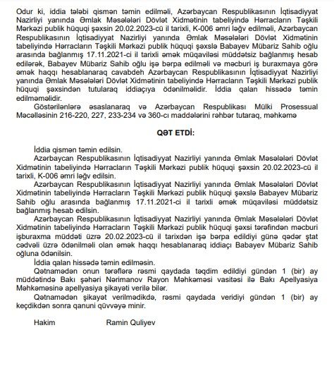 Əmlak Məsələləri Dövlət Xidmətinin tabeliyində fəaliyyət göstərən Hərracların Təşkili Mərkəzindəki işindən çıxarılan Mübariz Babayev məhkəmə qərarının 10 aydır ki, icra olunmamasından şikayətçidir.
