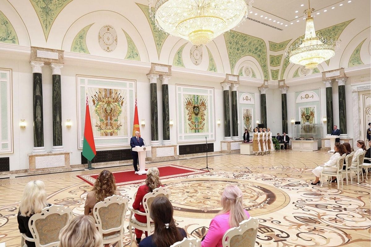Əvvəlcə Lukaşenko zalda toplaşan belaruslu qadınları qarşıdan gələn bayram münasibətilə təbrik edib.