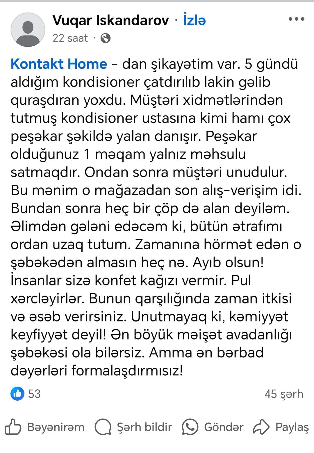 Tribuna.az xəbər verir ki, şikayətçi Vüqar İskəndərov problemini sosial şəbəkələrdə ictimailəşdirib. O bildirib ki, “Kontakt Home”dan 5 gün əvvəl aldığı kondisioner çatdırılıb, lakin hələ də gəlib quraşdıran olmayıb: