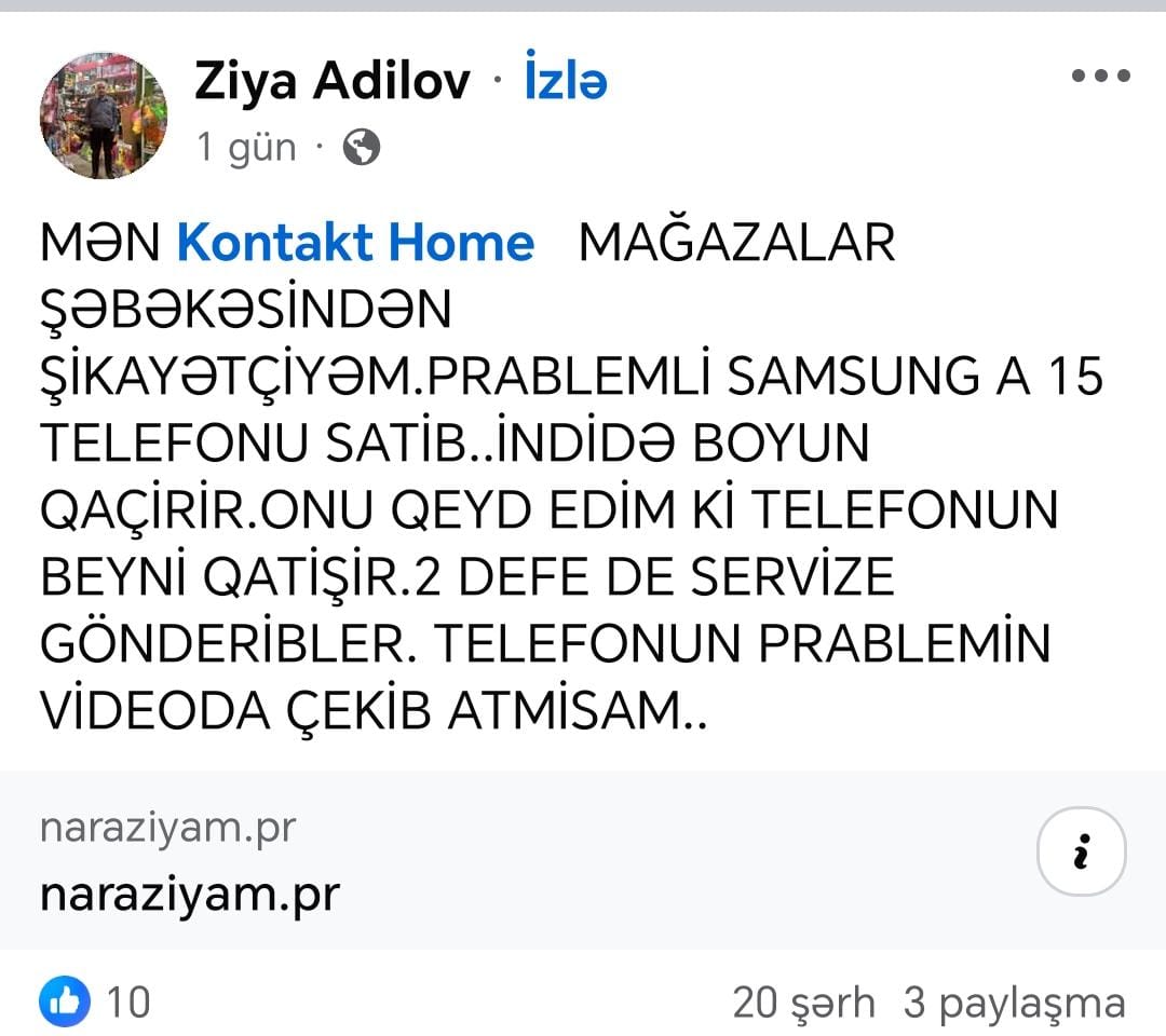 Qeyd edək ki, “Kontakt Home” mağazalar şəbəkəsi ilə bağlı bu tip şikayətlər çoxsaylıdır.