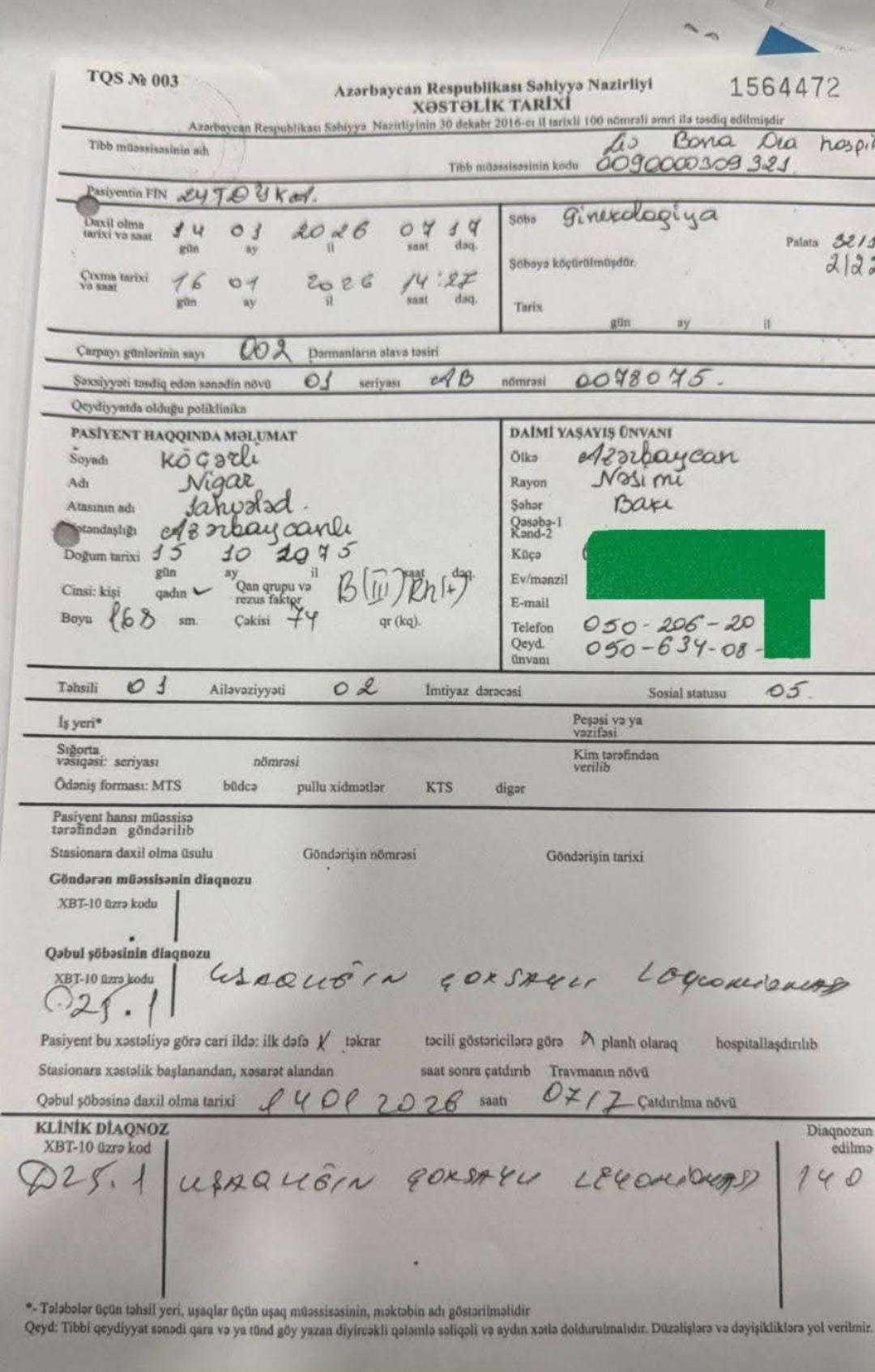 Həmin o blank, həqiqətən, yoxa çıxıb. Amma əlavədəki 3-cü fotoya diqqət yetirin. Bu, Liv Bona Dea tərəfindən təqdim olunan “xəstəlik tarixçəsi”dir. Burada qeyd etdiyim hər iki əlaqə nömrəsi mövcuddur. Qeyd edim ki, bu yazı mənə məxsus deyil — sənəd qeydiyyat əməkdaşı tərəfindən doldurulub. Bu isə o deməkdir ki, mən həqiqətən də əlaqə nömrələrini təqdim etmişəm”.