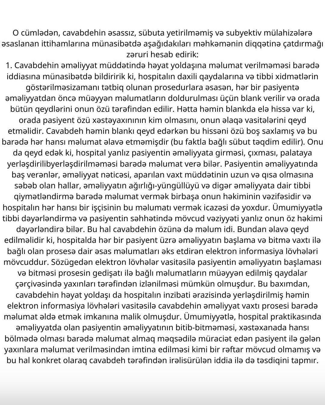 Bu halda isə əməliyyatı həyata keçirən həkim, öz sözlərinə görə, saat 10:30-da xəstəxananı tərk edib. Mən isə bundan sonra bir neçə saat ərzində ayılma otağında ağrıdan əziyyət çəkmiş, əlavə anesteziya verilməsi üçün yalvarmışam. Mənə bunun əlavə ödənişli olacağı bildirilib və razılaşmışam. Buna baxmayaraq, uzun müddət heç bir yardım göstərilməyib.