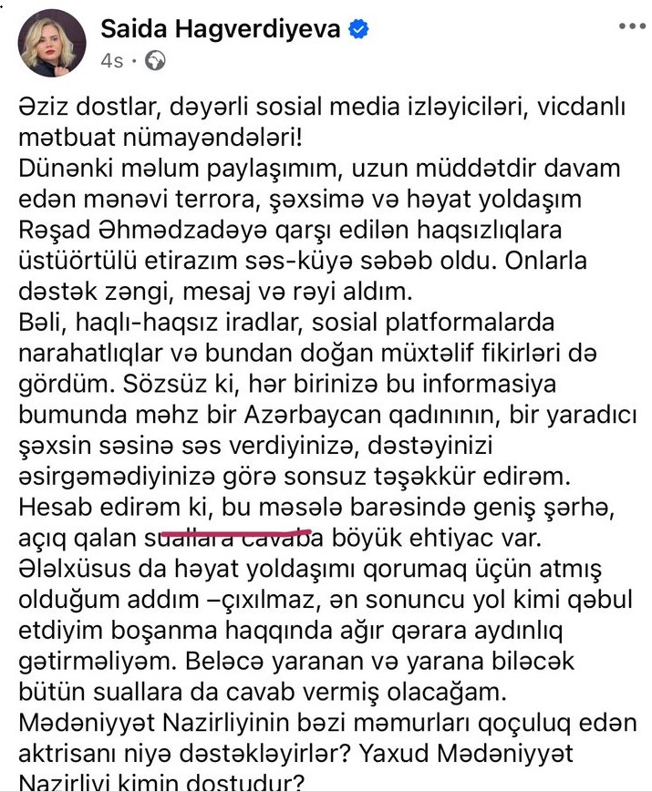 Yazıçı, Azərbaycan Kukla Teatrının quruluşçu rejissoru Səidə Haqverdiyeva sosial şəbəkədə uzun müddətdir davam edən mənəvi təzyiqlərə və həyat yoldaşı Rəşad Əhmədzadəyə qarşı edilən haqsızlıqlara etirazını bildirib.