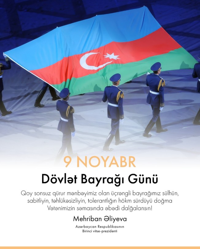 Azərbaycanın Birinci vitse-prezidenti Mehriban Əliyeva 9 Noyabr – Dövlət Bayrağı Günü münasibətilə paylaşım edib.