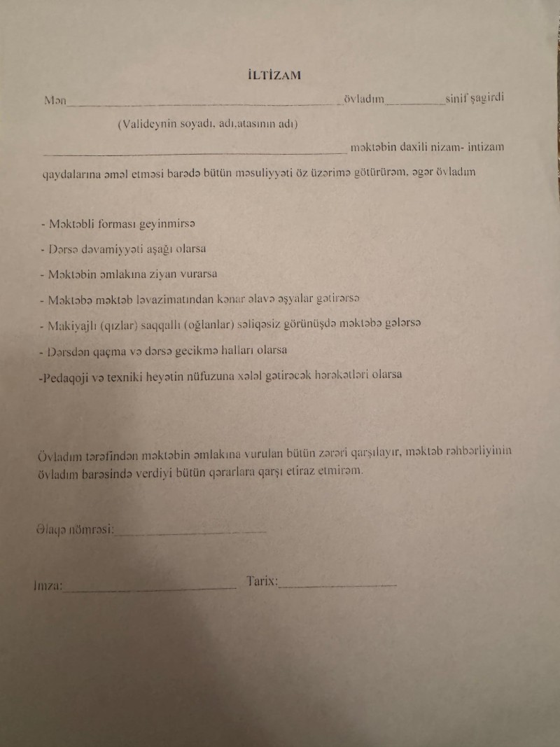 Son vaxtlar bir çox məktəblərdə valideynlərdən “İltizam” adlı sənədi imzalamaq tələb olunur.
