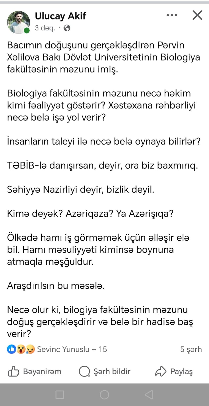 Necə olur ki, bilogiya fakültəsinin məzunu doğuş gerçəkləşdirir və belə bir hadisə baş verir?”.