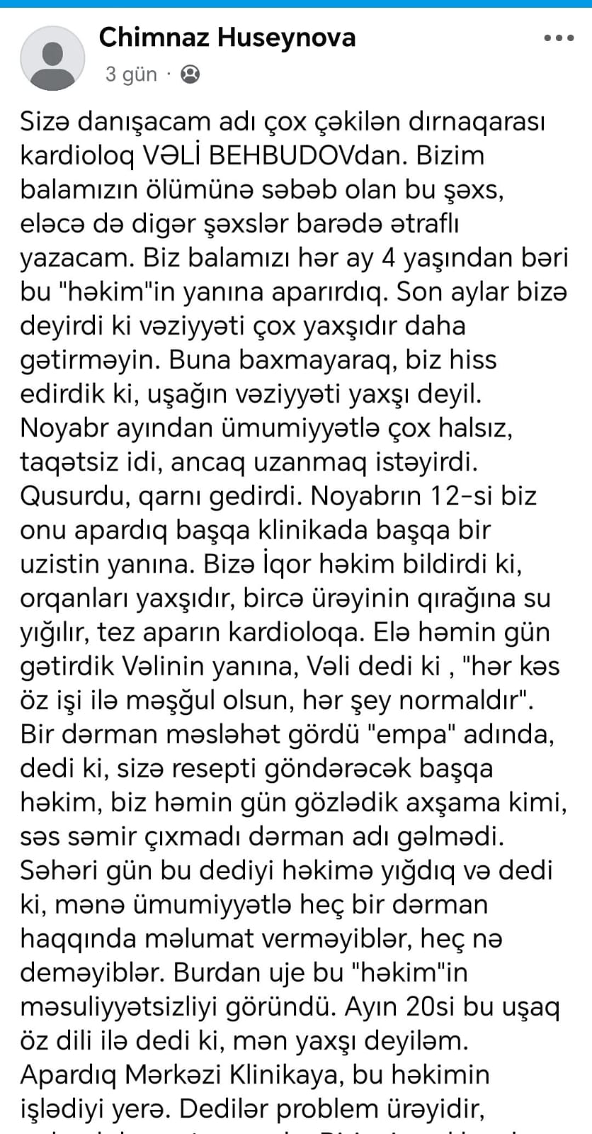 Mərkəzi Klinikanın kardioloq həkimi Vəli Behbudov bizim balamızın ölümünə səbəb oldu. Halbuki biz balamızı 4 yaşından 12 yaşına qədər hər ay bu “həkim”in yanına aparırdıq.