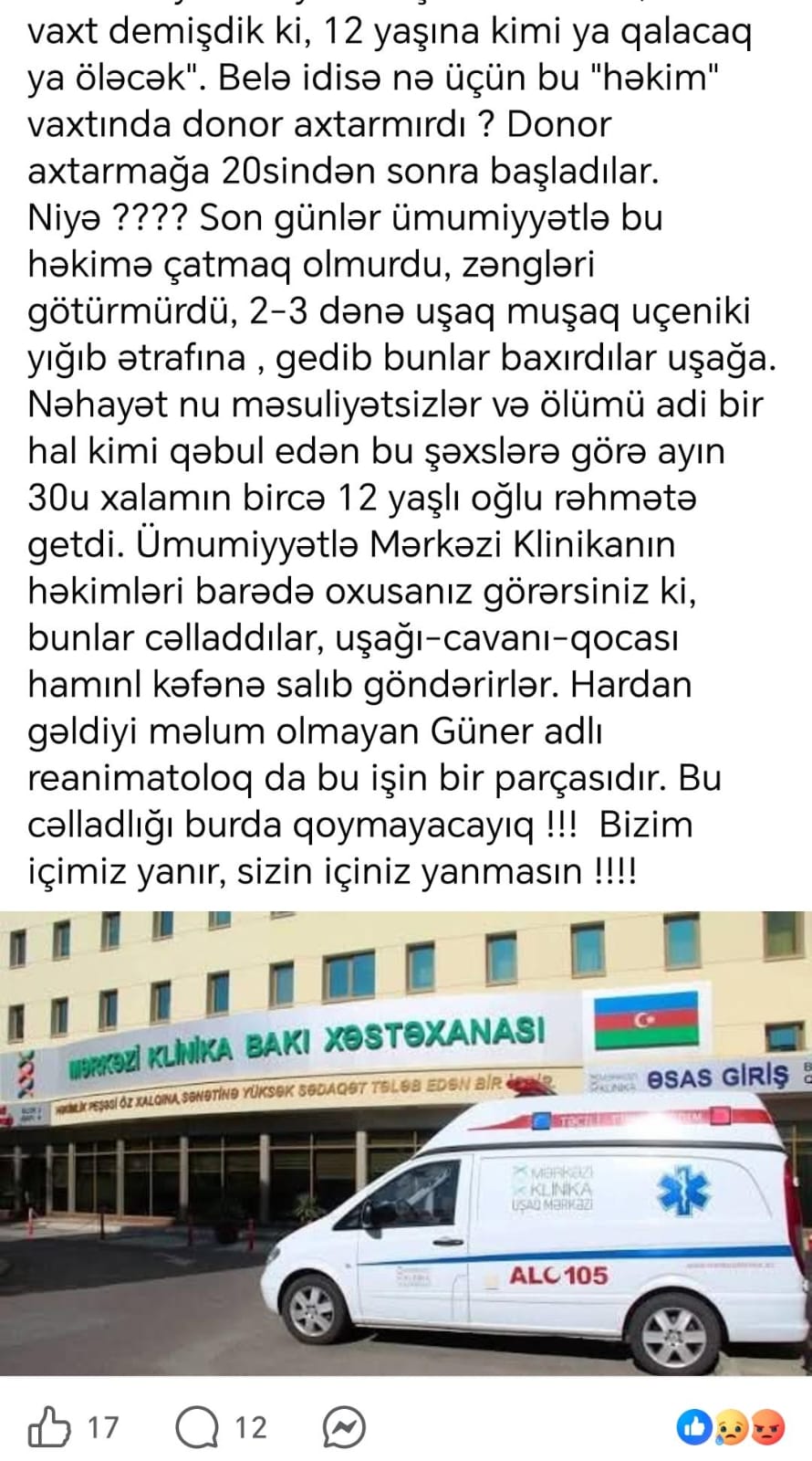 Ümumiyyətlə Mərkəzi Klinikanın həkimləri barədə oxusanız görərsiniz ki, bunlar cəlladdılar, uşağı-cavanı-qocası hamını kəfənə salıb göndərirlər. Haradan gəldiyi məlum olmayan Güner adlı reanimatoloq da bu işin bir parçasıdır. Bu cəlladlığı burda qoymayacayıq !!! Bizim içimiz yanır, sizin içiniz yanmasın”.
