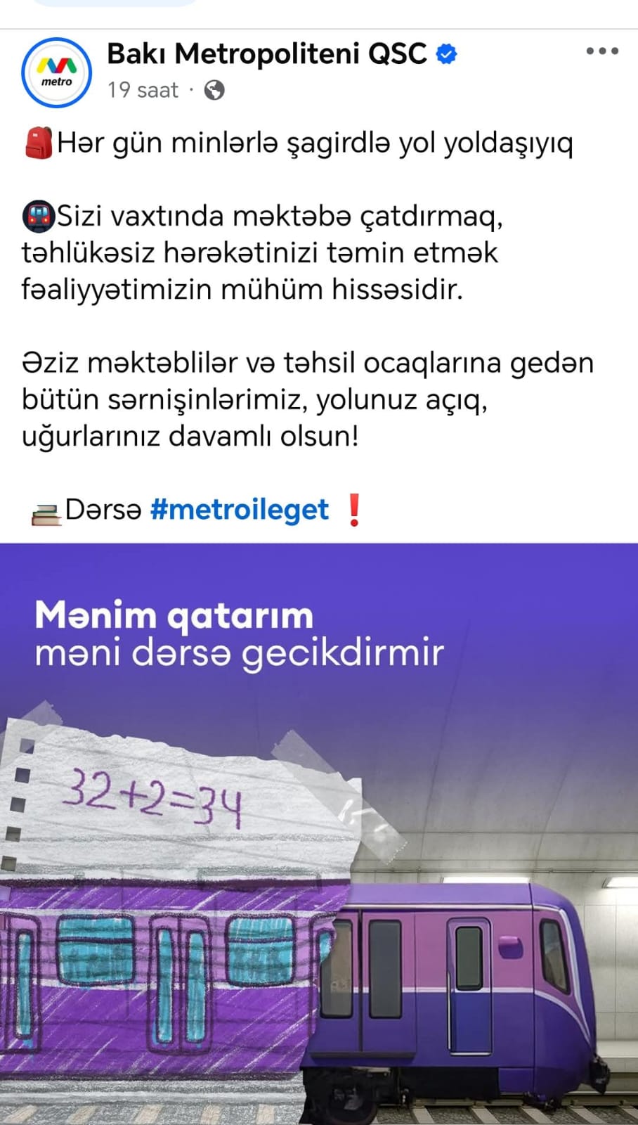 “Bakı Metropoliteni” QSC “Məktəbli avtobusları”na qarşı “dərsə metro ilə get” çağırışı edib.